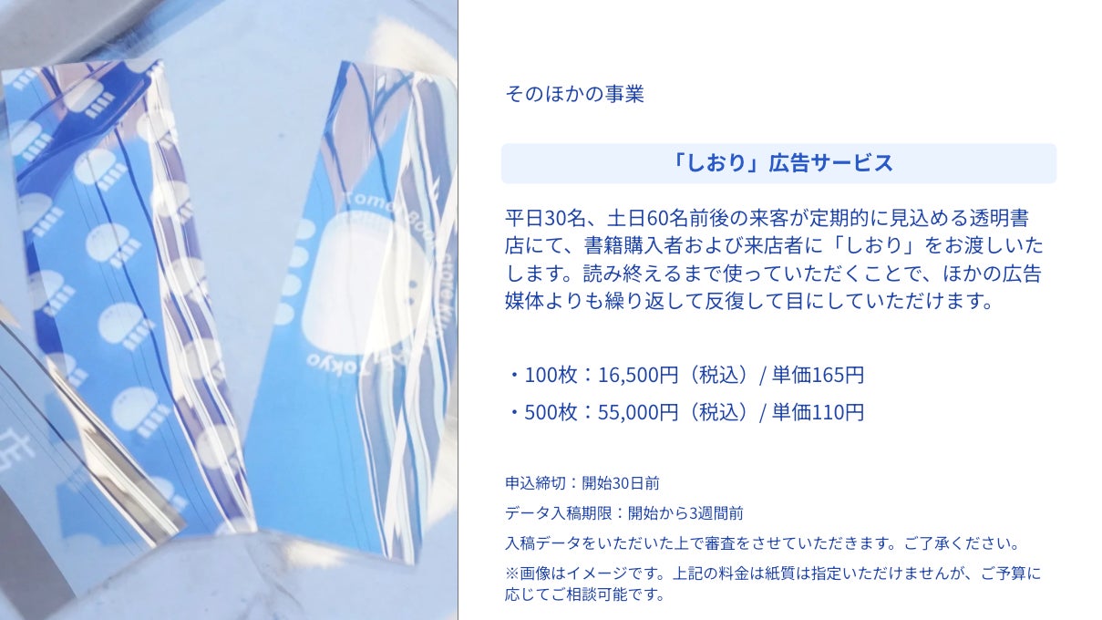 透明書店にて、書籍購入者および来店者にお渡しする「しおり」に広告を入れられるサービスです。