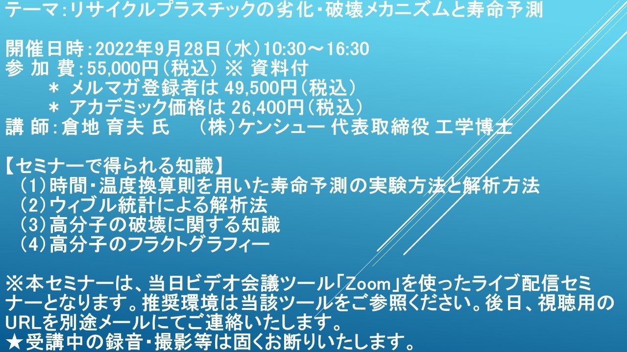 先端技術情報や市場情報を提供している(株)シーエムシー・リサーチ(千代田区神田錦町: https://cmcre.com/ )では、 各種材料・化学品などの市場動向・技術動向のセミナーや書籍発行を行っておりますが、 このたび「リサイクルプラスチックの劣化・破壊メカニズムと寿命予測」と題するセミナーを、 講師に倉地 育夫 氏 ㈱ケンシュー 代表取締役 工学博士)をお迎えし、2022年9月28日(水)10:30より、 ZOOMを利用したライブ配信で開催いたします。 受講料は、 一般:55,000円(税込)、 弊社メルマガ会員:49,500円(税込)、 アカデミック価格は26,400円(税込)となっております(資料付)。