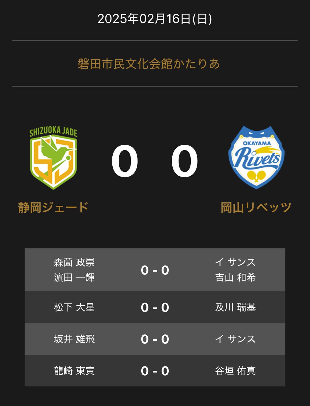 ノジマTリーグ 2024-2025シーズン 公式戦 2月16日開催 静岡ジェードvs岡山リベッツ 対戦オーダー発表