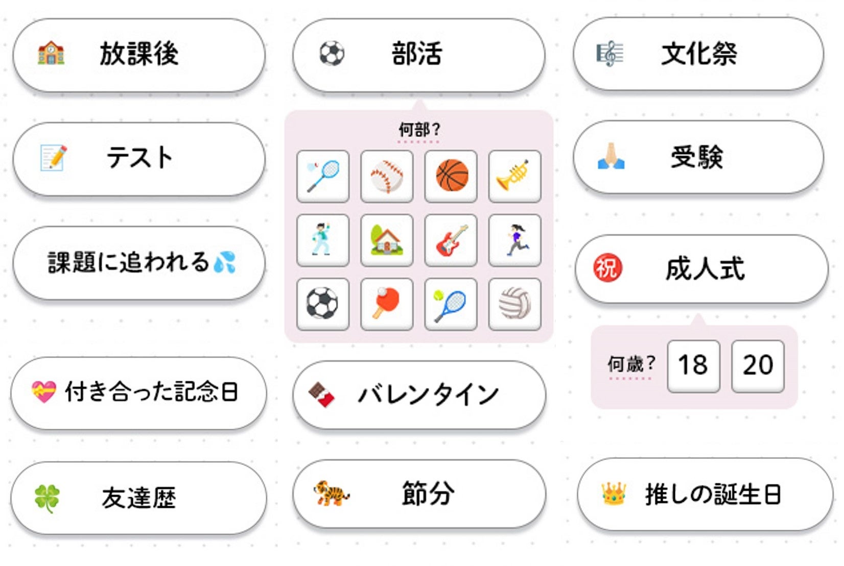『EVERFILM』では、撮影するテーマを60種類以上から選べる新機能を搭載。“些細な想い出もプリで記念に残してほしい”という思いで、「ハロウィン」「クリスマス」などの定番イベントに加え、「部活」「放課後」といった学校行事のほか「チートデー」「花粉症しんどい」など日常の中にあるたわいのないものまで様々にご用意しました。