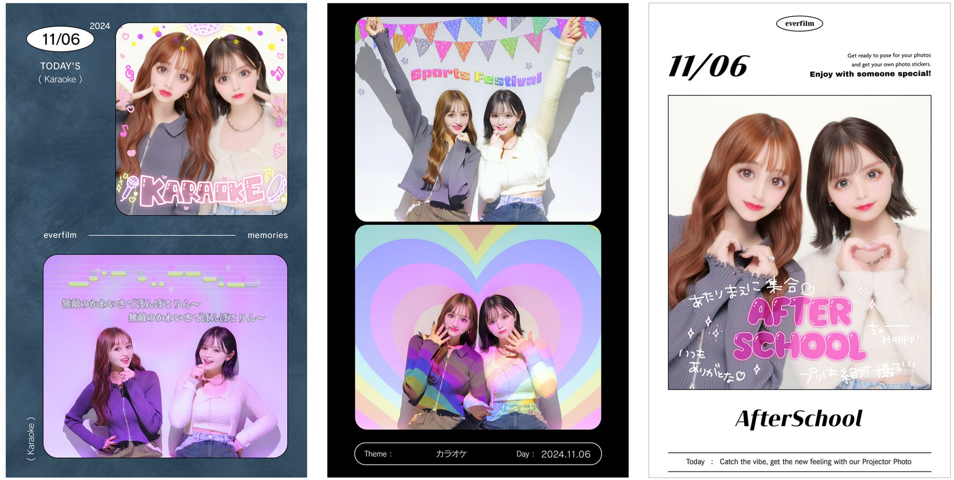 『EVERFILM』はプリ本来の魅力である、“その日の想い出を可愛く、楽しく残す”ことを再提案する最新機種です。“盛れる”写り・想い出作り・楽しさにこだわった機能をふんだんに搭載。残したい想い出に合わせて撮影テーマを選べる新機能、プロジェクターを使って空間全体を盛り上げる演出、見返す度に想い出がよみがえる落書きスタンプやシールなど、“盛る”以外の楽しさも提案します。