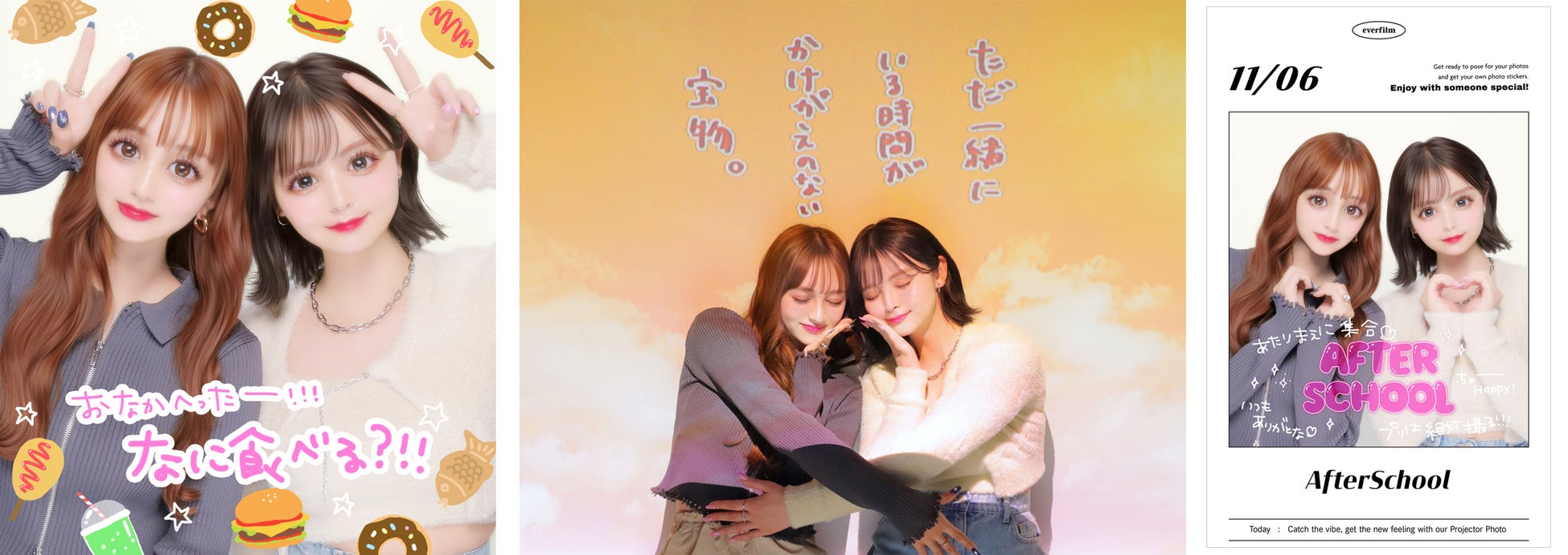 『EVERFILM』は、友達と一緒にわいわい盛り上がりながら撮影する楽しさ、日常にある些細な出来事すらも特別な想い出として形に残せる撮影体験、後から見返した時に“その日、何をしていたか”までを思い出せる画像・シールの仕上がり、が魅力。プリ機開発に20年以上携わるフリューが、“プリで想い出を可愛く、楽しく残す価値”を改めて提案します。