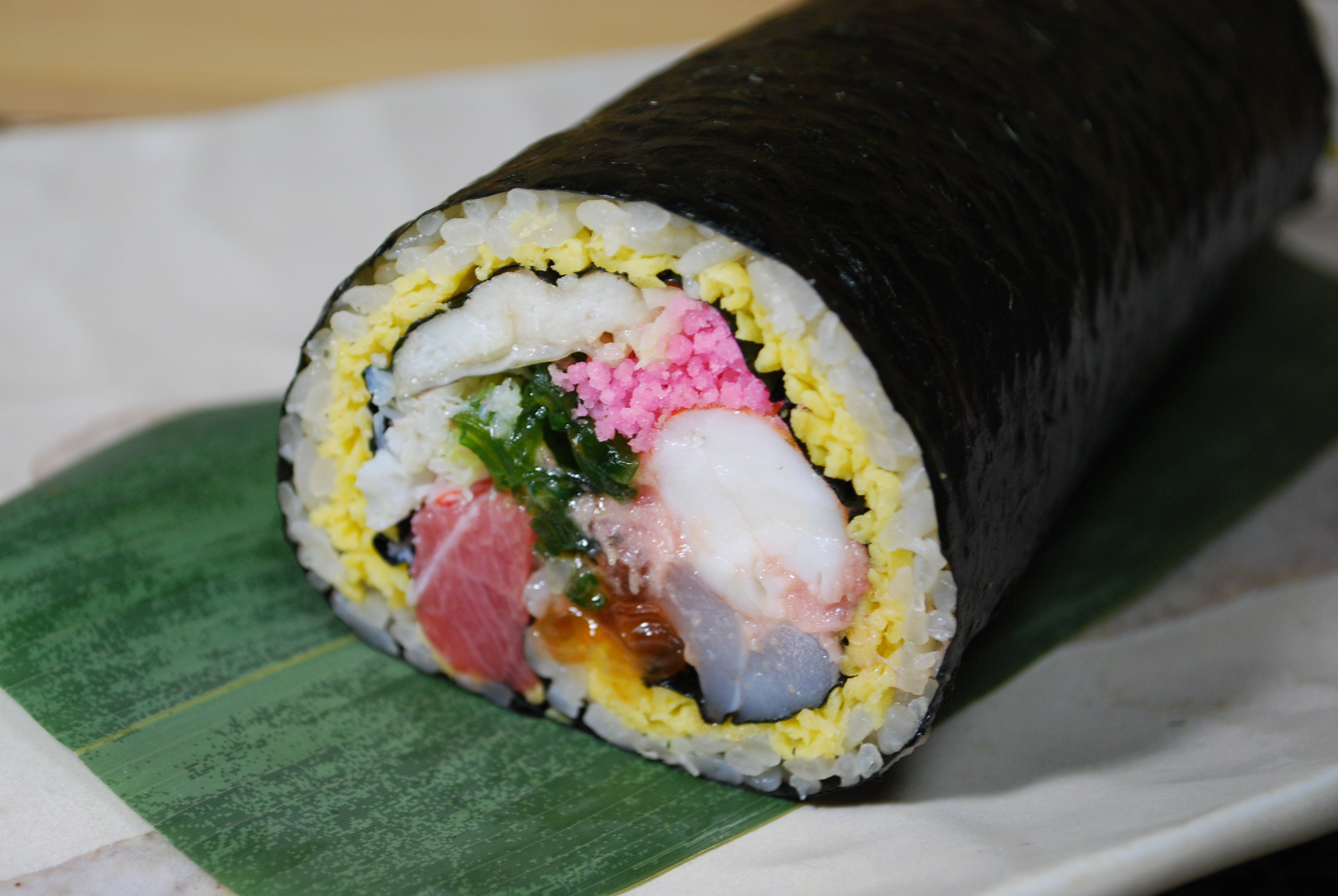 具材:玉子焼、蟹蒲鉾、きゅうり、干瓢、椎茸、おぼろ、白胡麻