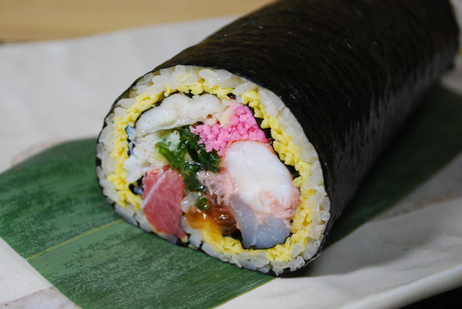 具材:ボイル海老、マグロ、サーモン、カニ風味蒲鉾、すじこ醤油漬、煮干瓢、きゅうり、玉子焼、おぼろ、子持昆布