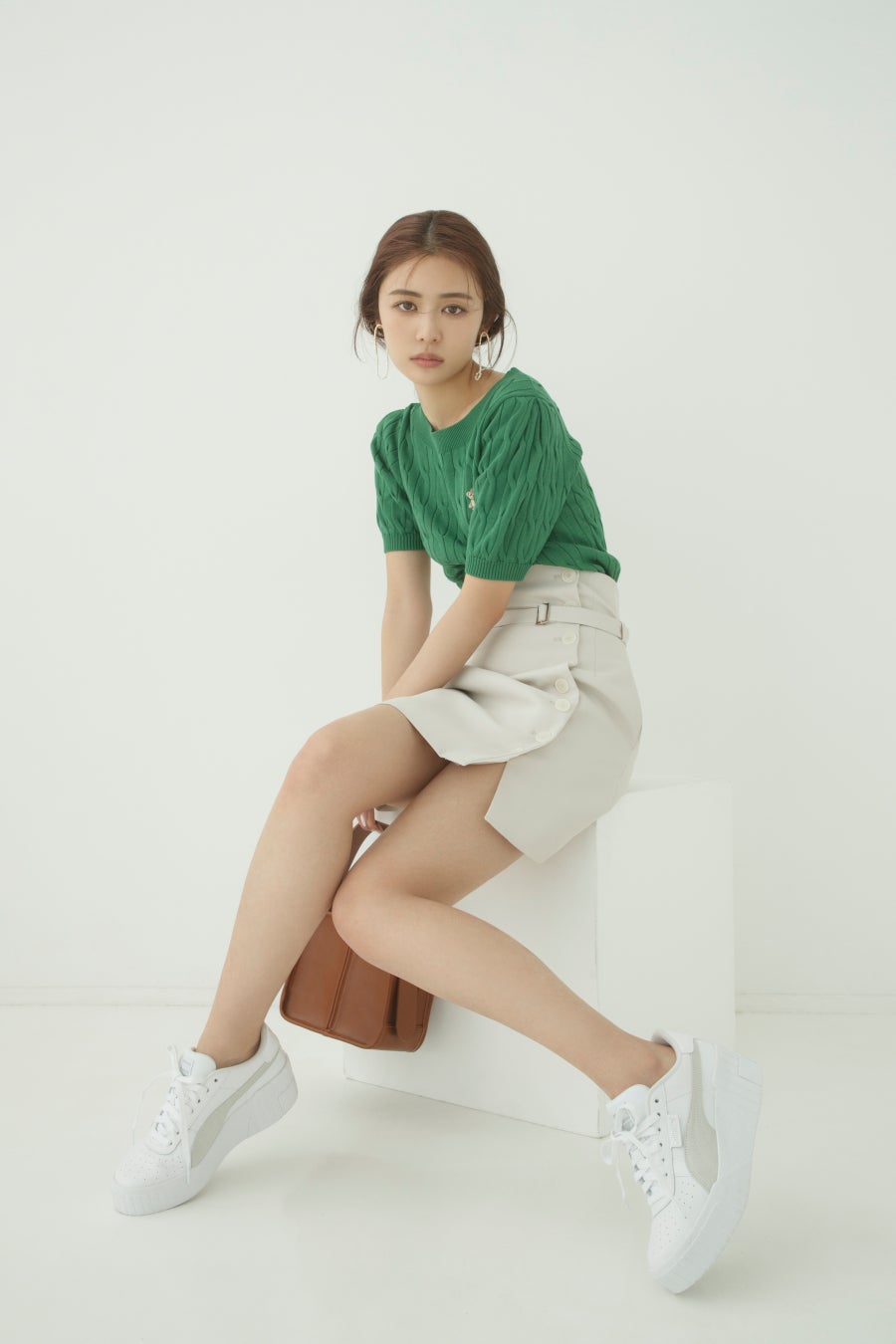 スニーカーはピュアホワイトボディに、サイドのスウェード部分をライトベージュでワントーンにまとめ、メタリック調のPUMAロゴをアクセントにした暑い夏に映えるさわやかな一足に仕上げました。約5cmのウェッジソールは脚長効果をもたらし、ミニボトムとも相性抜群です。
