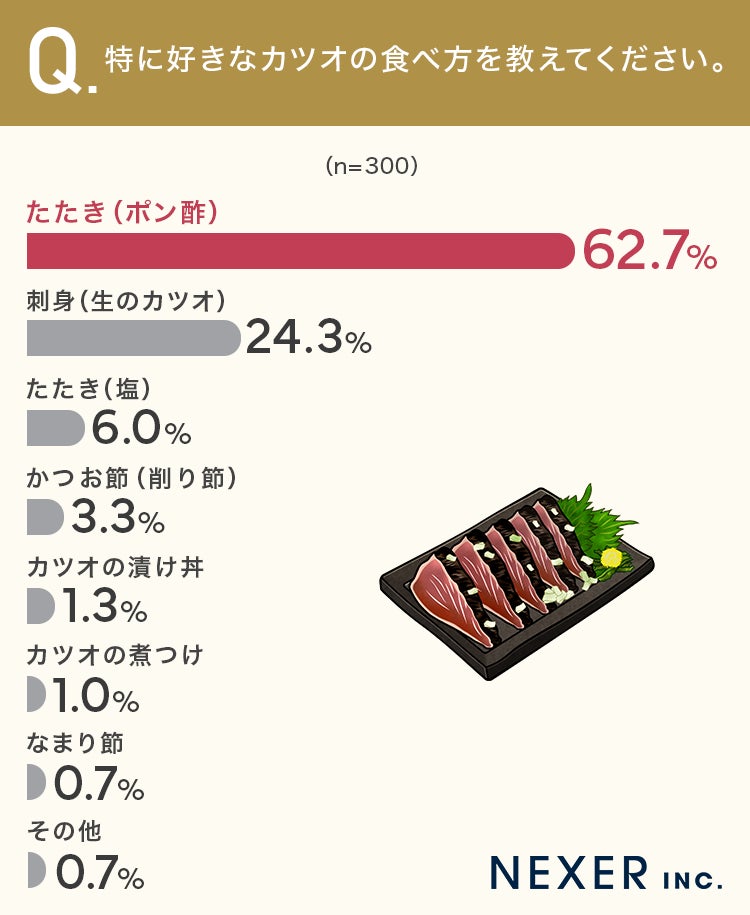 そこで今回はかつお公社と共同で、事前調査で「普段カツオ料理を食べる」と回答した全国の男女300名を対象に「カツオの食べ方」についてのアンケートをおこないました。