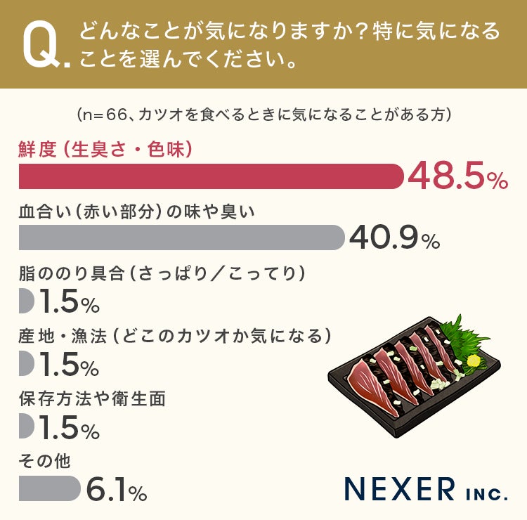一方で、生臭さや薬味・タレの好みなど、カツオを食べる際に気になるポイントもあるようです。