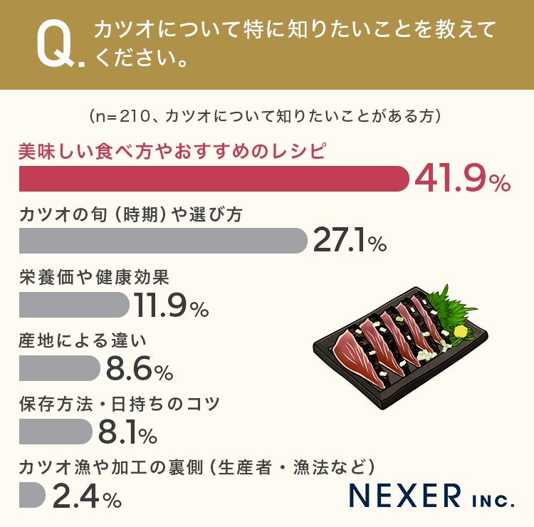 さらに、4割以上が「おすすめのレシピを知りたい」と回答しており、カツオをより美味しく楽しみたいという意識もうかがえます。