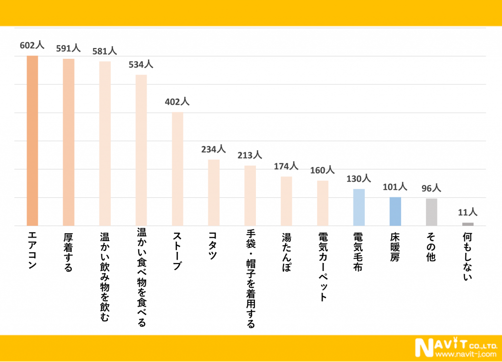 寒さ対策についてのアンケートを複数回答にて回答いただきました。一番多かった回答は「エアコン」で602人、次が「厚着をする」で591人。3番目に「暖かい飲み物を飲む」が581人と続いています。