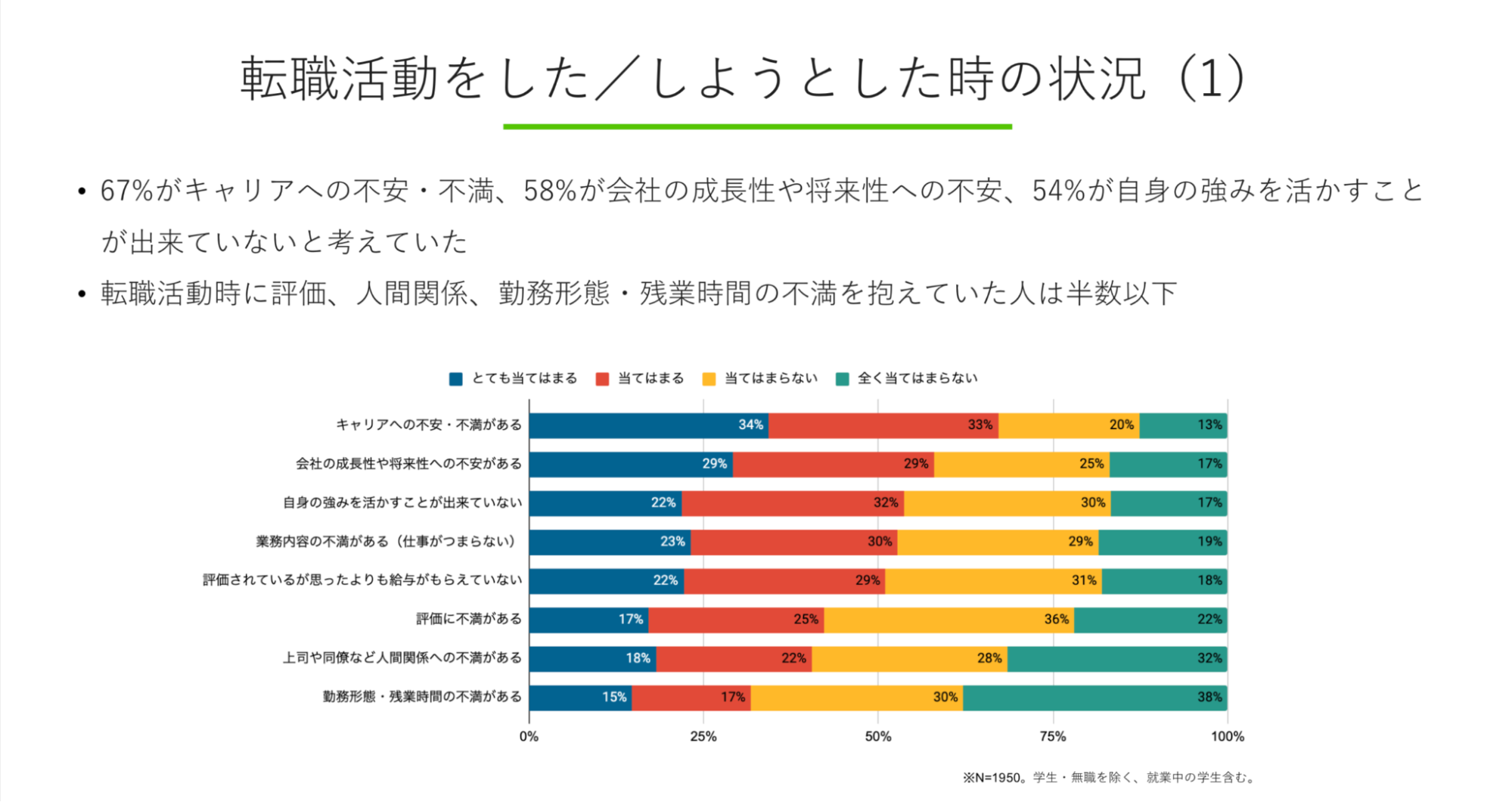 エンジニアを対象に実施したアンケート調査(エンジニア白書2021:https://qiita.com/white_papers/2021)から、転職活動を考えたきっかけとして、67%のエンジニアがキャリアへの不安や不満、58%のエンジニアが会社の成長性や将来性への不安、54%のエンジニアが自分の強みを活かすことができていないと考えていることが分かりました。