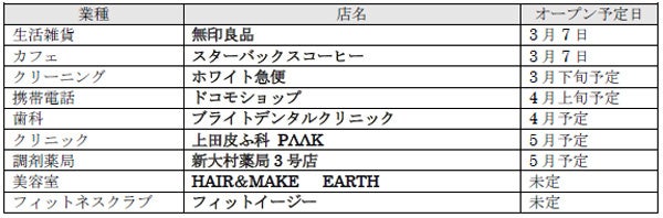 このたび、当社が担当する商業施設街区のテナントとして、周辺地域の皆さまの生活をより豊かにする以下の9店舗が決定しました。オープン日は、イズミが開発するスーパーマーケット「ゆめマート新大村」と「無印良品」「スターバックスコーヒー」が3月7日、その他の店舗は順次開業を予定しています