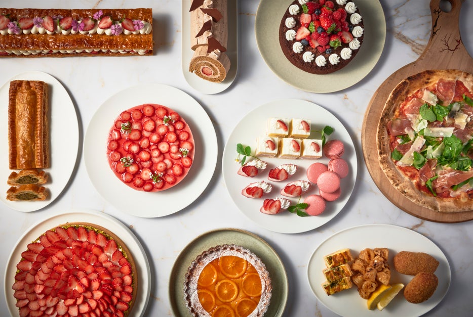 3階「ブラッスリー・デュ・ケ」では、春の訪れを感じさせる苺を主役に、ムースやショートケーキ、タルト、ジュレ、マカロンなど、苺を贅沢に使ったスイーツを心ゆくまでお楽しみいただける豪華なデザートブッフェを開催いたします。ライブステーションではパティシエがお客様の目の前で仕上げる「ロングミルフィーユ」を提供し、焼きたてのパイのサクサク感と滑らかなクリームの絶妙なハーモニーをお楽しみいただけます。また、「季節のキッシュ」や「ウェスティンホテル横浜特製カレー」、ピザ窯で焼き上げる「シェフのおまかせピザ」などのセイボリーアイテムも取り揃え、飽きることない贅沢な時間をお過ごしいただけます。