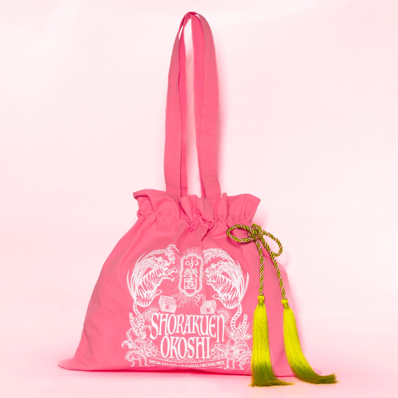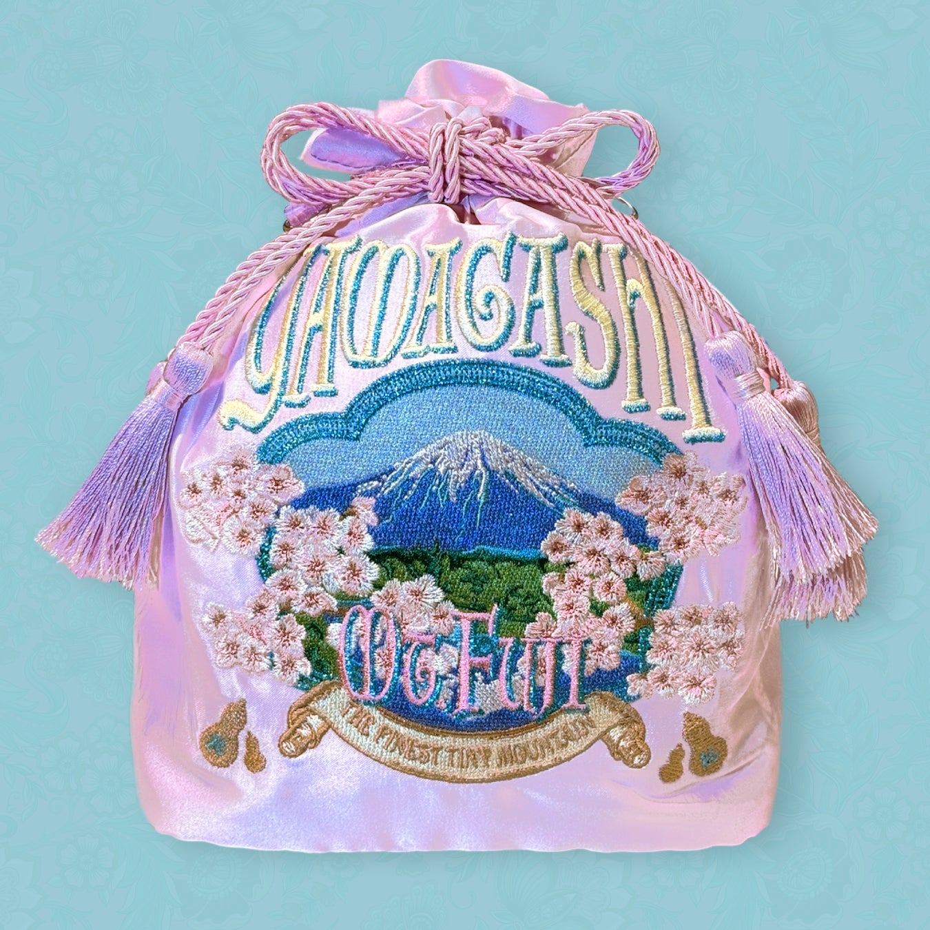 マットなサテン地に山菓子 富士山の絵柄、富士山と桜の刺繍を施したYAMAGASHI巾着バッグを阪急先行販売します。付属のメタルチェーンで肩掛けバッグとして使用することも。また「小楽園」で人気のお菓子の一つであるおこし缶の絵柄がプリントされた、おこしバッグの新色TOGENKYO PINKも阪急先行販売します。
