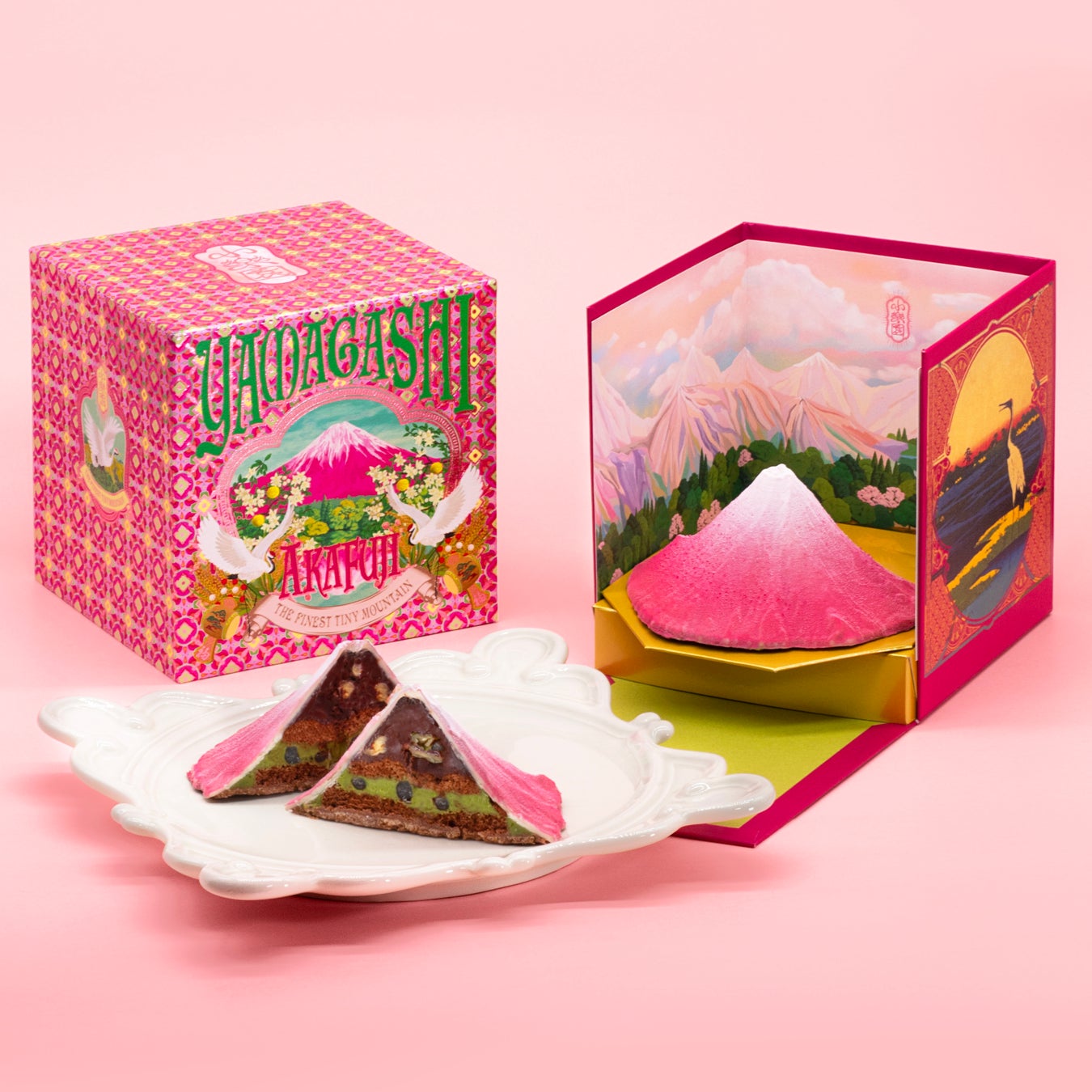「小楽園」の代表的なスイーツ、山菓子。日本に実在する美しい山々を手のひらサイズのお菓子に仕立てました。山々の稜線を国土地理院の地形データから忠実に象り、それぞれの地方の特産品を使用するなど、山々の魅力を忠実に再現。デザイン性の高いお洒落なパッケージで、他とは違うギフトとしてもおすすめです。