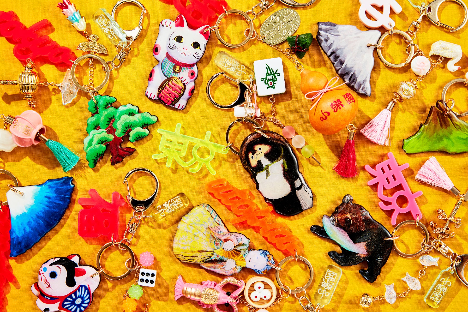 アトリエで1つ1つ手作りで制作しているOMIYAGEキーホルダー。招き猫や信楽たぬき、松など日本ならではのモチーフながらも、ユニークな組み合わせと色使いが魅力です。