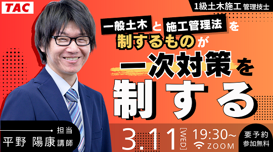 簿記検定試験、税理士、公認会計士などの資格取得に向けた教育サービスを展開しているTAC株式会社(東京都千代田区、代表取締役:多田 敏男)は、2026年3月11日(水) 19:30より、一級土木施工管理技士 一般土木と施工管理法を制する者が一次対策を制するというテーマでオンラインセミナーを開催します。