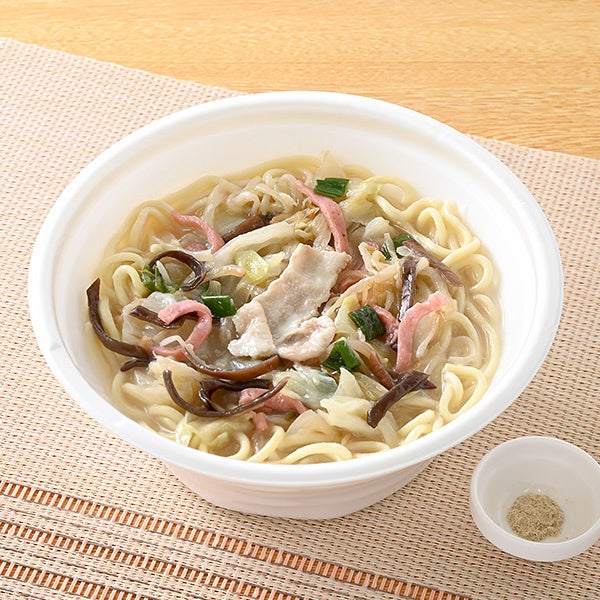 【内容】粘りのあるちゃんぽん麺を使用し、工場で炊きだしたとんこつスープと豚ガラスープを合わせることでコクのあるスープに仕立てました。具材は、きくらげやかまぼこを入れた野菜炒めと豚肉を盛りつけました。お好みで別添のホワイトペッパーをかけてお楽しみください。