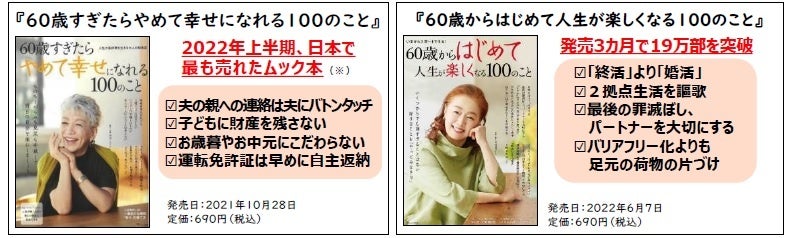 累計160万部を突破した本シリーズは、60歳以降の人生を豊かに生きるためのヒントやアドバイスを、その道の有識者だけでなく、該当世代の方々へのアンケートをもとに作成。シリーズ第1弾『60歳すぎたらやめて幸せになれる100のこと』は、発売直後から全国の書店で売り上げ1位を獲得し、2022年上半期で最も売れた(※)ムック本となりました。