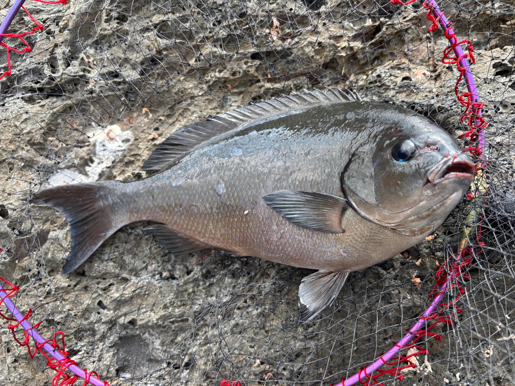 日本近海の磯釣りで釣れるメジナ(グレ)の仲間は、口太グレ(メジナ)、尾長グレ(クロメジナ)、ウシグレ(オキナメジナ)が知られる。もっとも身近なターゲットしては口太グレがつとに有名だが、口太グレよりもさらに大型になり、引きも強いことから憧れとなっているのが尾長グレだ。口太グレよりもやや南方系の魚種。尾長グレはエラブタの縁が黒い点や、鱗に黒い斑紋がある点、尾ビレの上下先端が尖り、切れ込みがある点などで口太グレと区別できる。口太グレに比べると、歯が鋭く、鈎を飲み込まれるとハリスを切られることが多くなるなど、ヒットさせてからの取り込みもテクニカル。