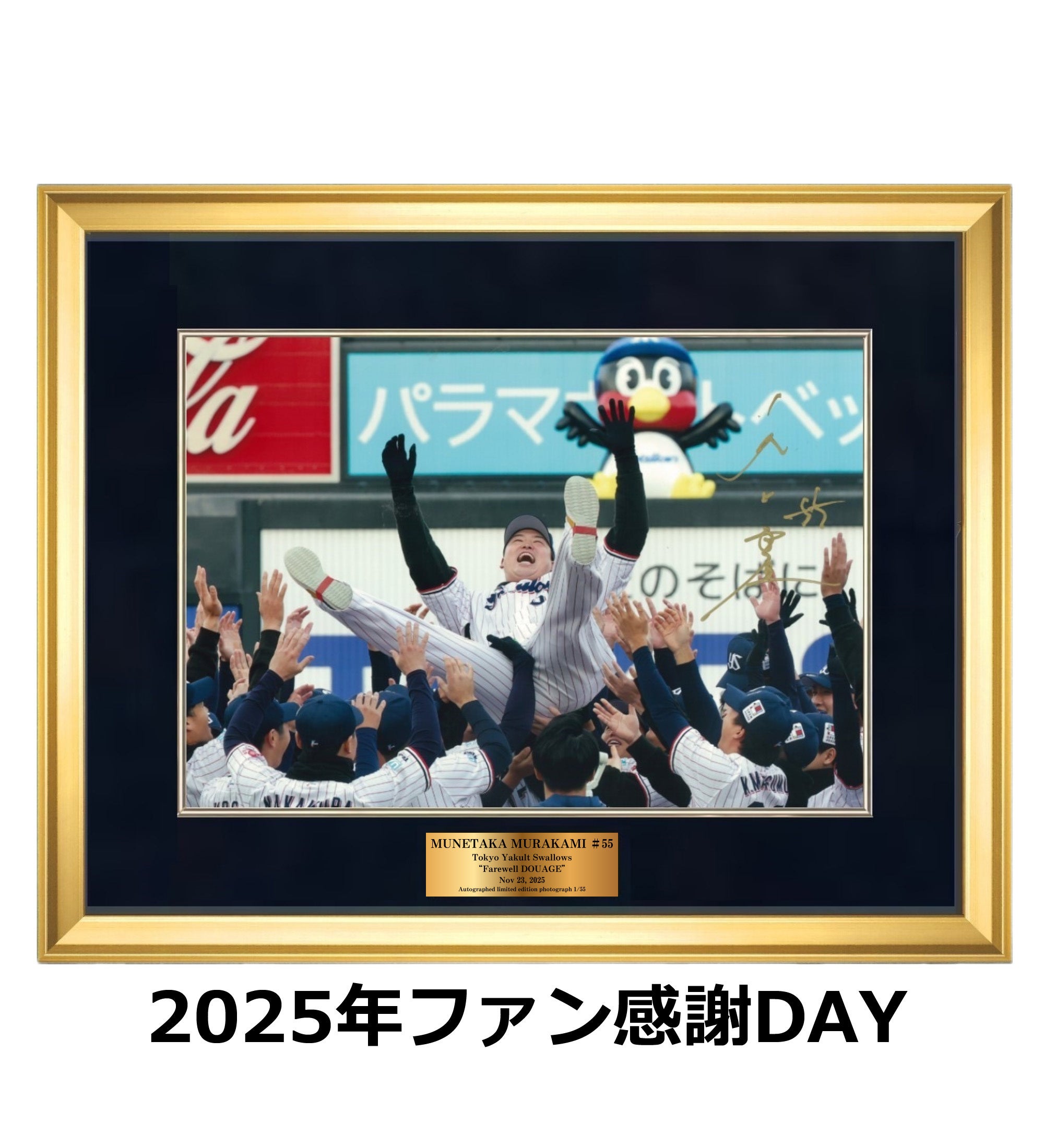 商品は、産経新聞・サンケイスポーツが撮影したプロ野球・東京ヤクルトスワローズ時代の写真から厳選した「2025年神宮初HR」「2025年ファン感謝DAY」の2種類です。村上選手の背番号「55」にちなんで、限定各55枚を製作しました。このうちシリアルナンバー「55/55」は村上選手本人が所有、各54枚を販売(先着順)します。いずれも、代金は16万5000円(税・送料込み)です。