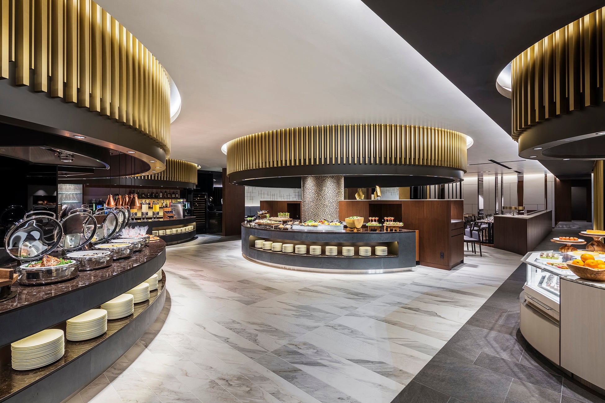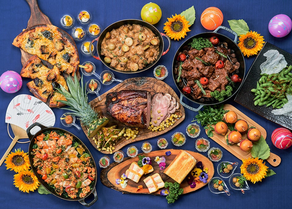 豚肉のロティー ハワイアン風 /スペアリブのラケ仕立て BBQソース/お魚のベニエとレムラードソース /鶏肉のグリル タンドゥーリ風(ランチ限定)/牛肉のビール煮込み フランドル風(ディナー限定)/京漬物のピラフ(ランチ限定)/フレッシュパインのエスニックピラフ(ディナー限定)/お野菜のポタージュ/ココナッツ風味のイエローカレー /ピッツァボロネーゼ /ニョッキのカルボナーラ仕立て/ポテトとミートのシェパーズパイ/白身魚のポワレ リグーリア風 /ライスプディング “リ・オ・レ”/プティ・パリブレストととうもろこしのムーステリーヌ /スモークサーモンとチーズのクロックケーク(ランチ限定)/ツナとトマトの冷製カッペリーニ バジル風味 /サラダ各種 /パン各種 などデザート含む約70種類