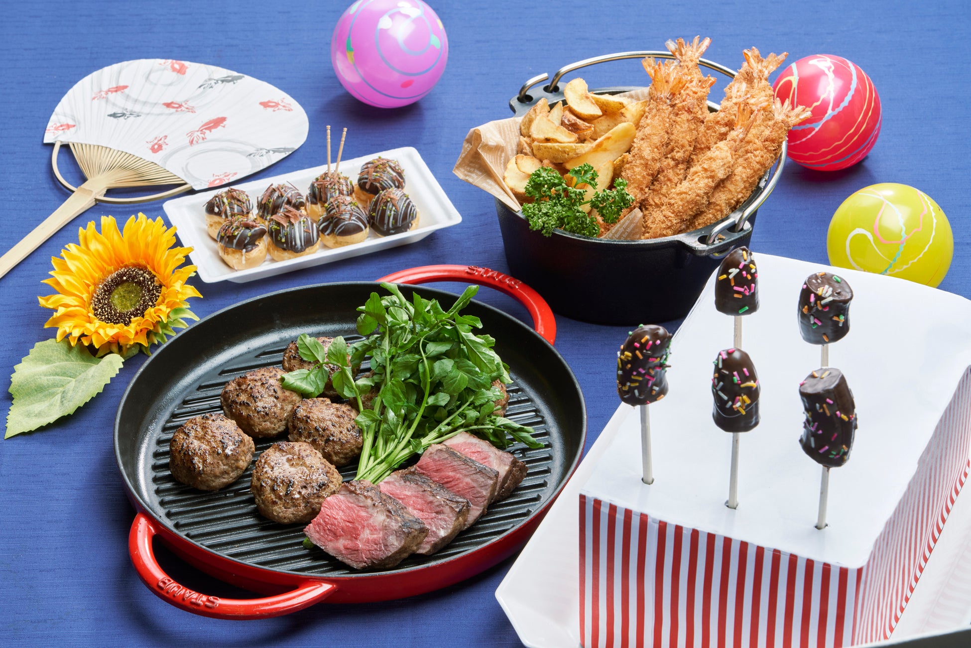 さらに夏祭り気分を盛り上げるメニューとして、振って愉しい「ふりふりポテト」、ひんやり冷たい「ふわふわかき氷」や「一口チョコバナナ」など夏らしい味覚も勢ぞろい。また、「たこ焼き風!?プティシュークリーム」はたこ焼きそっくりの見た目ですが、一口食べるとクリームとチョコの風味が広がるユニークなスイーツです。その他ミニ駄菓子コーナーも設置し、バラエティ豊かな「食の縁日」を大人から子どもまで一緒に愉しめます。