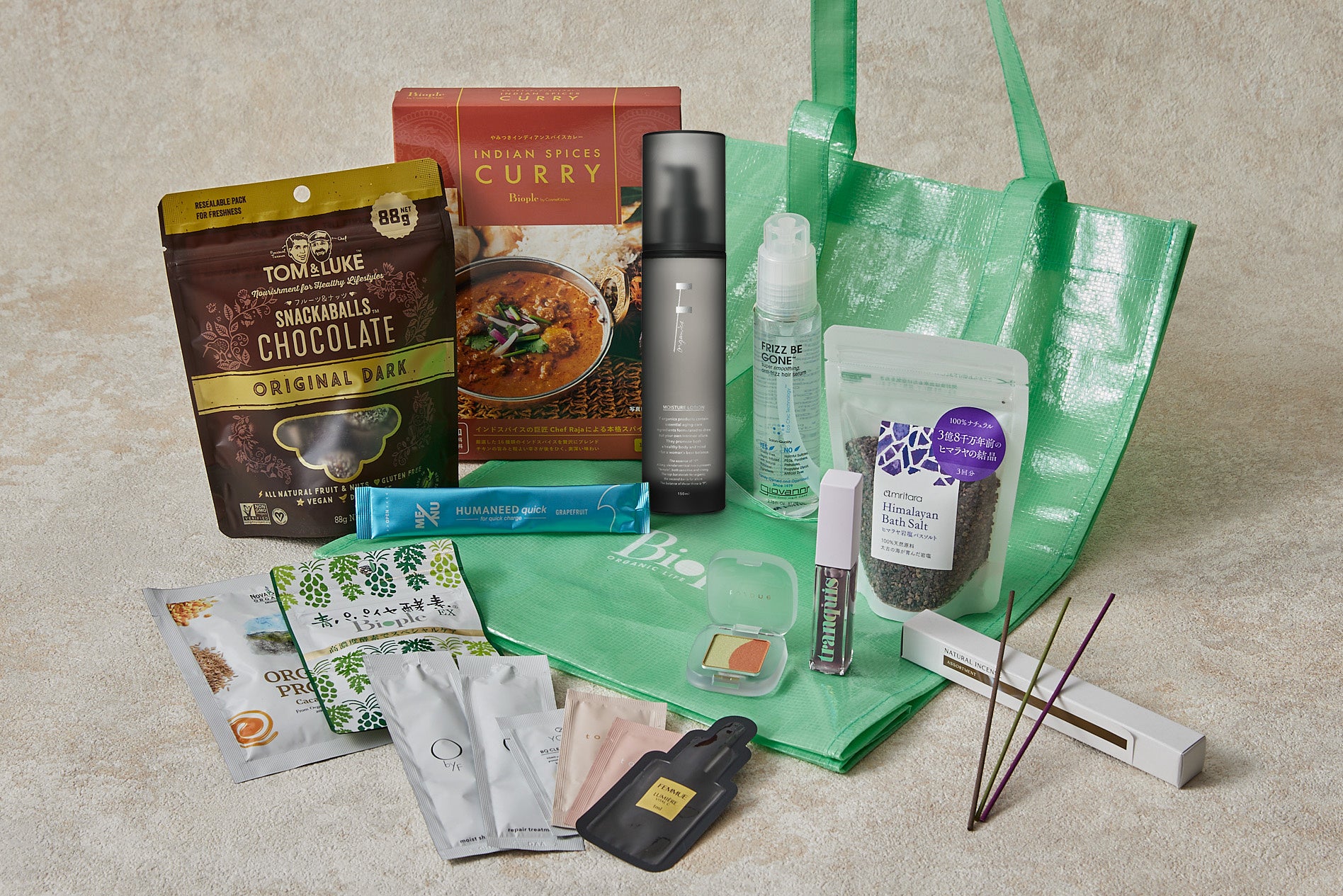 Biople のインナーケアで不動の人気を誇る「Bio-Normalizer(バイオノーマライザー)」の青パパイヤ酵素や、スパイスフェアでも人気の「やみつきINDIAN SPICES CURRY」の他、ベストセラー化粧水「F organics(エッフェオーガニック)」のモイスチャーローションなど、今回初めてBiopleアイテムを手に取っていただく方にもきっとご満足いただける充実のラインアップ。 再生素材を40%以上使用した、サステナブルなエコバッグに詰め込んでお届けいたします。