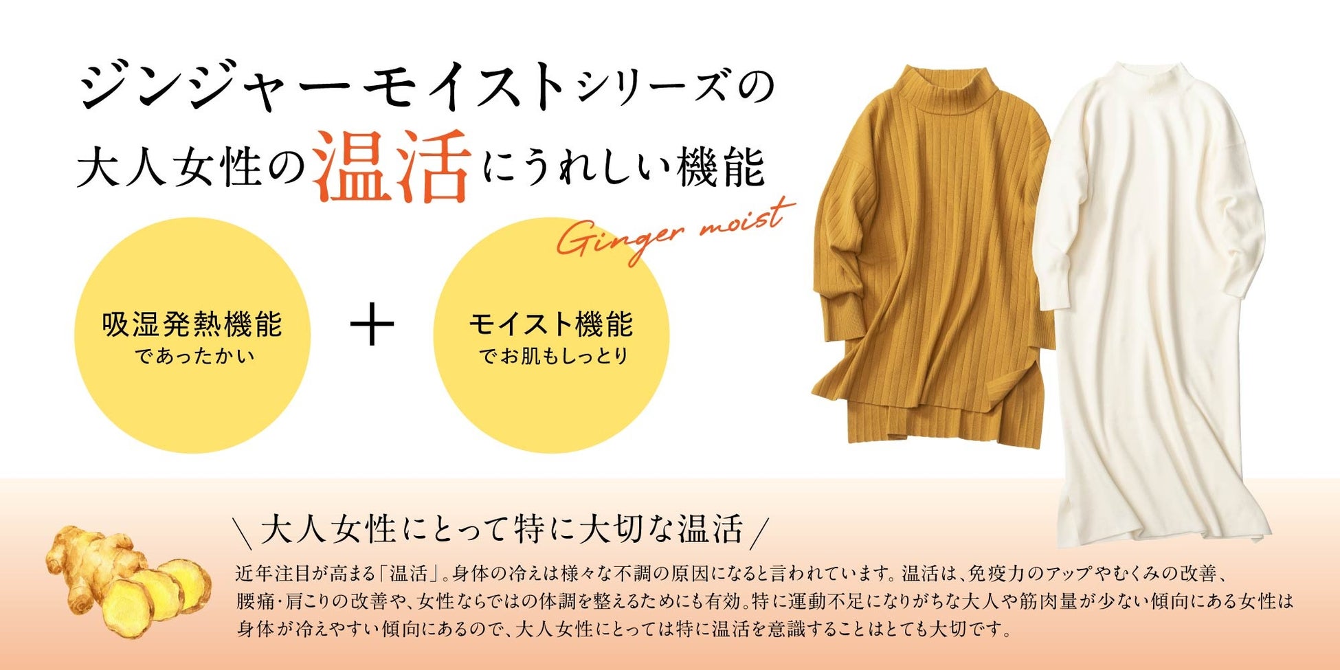 この冬は大人女性の温活にフォーカス。Eluraで毎年大人気の吸湿発熱&モイスト機能を兼ね備えた<ジンジャーモイスト>シリーズのラインアップに、インナーやニット加えて、腹巻やレギンスなどまでアイテムを拡大しました。