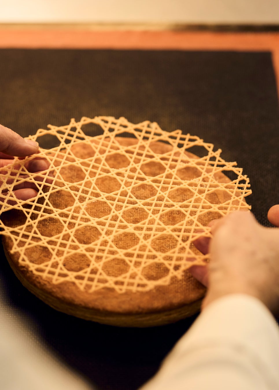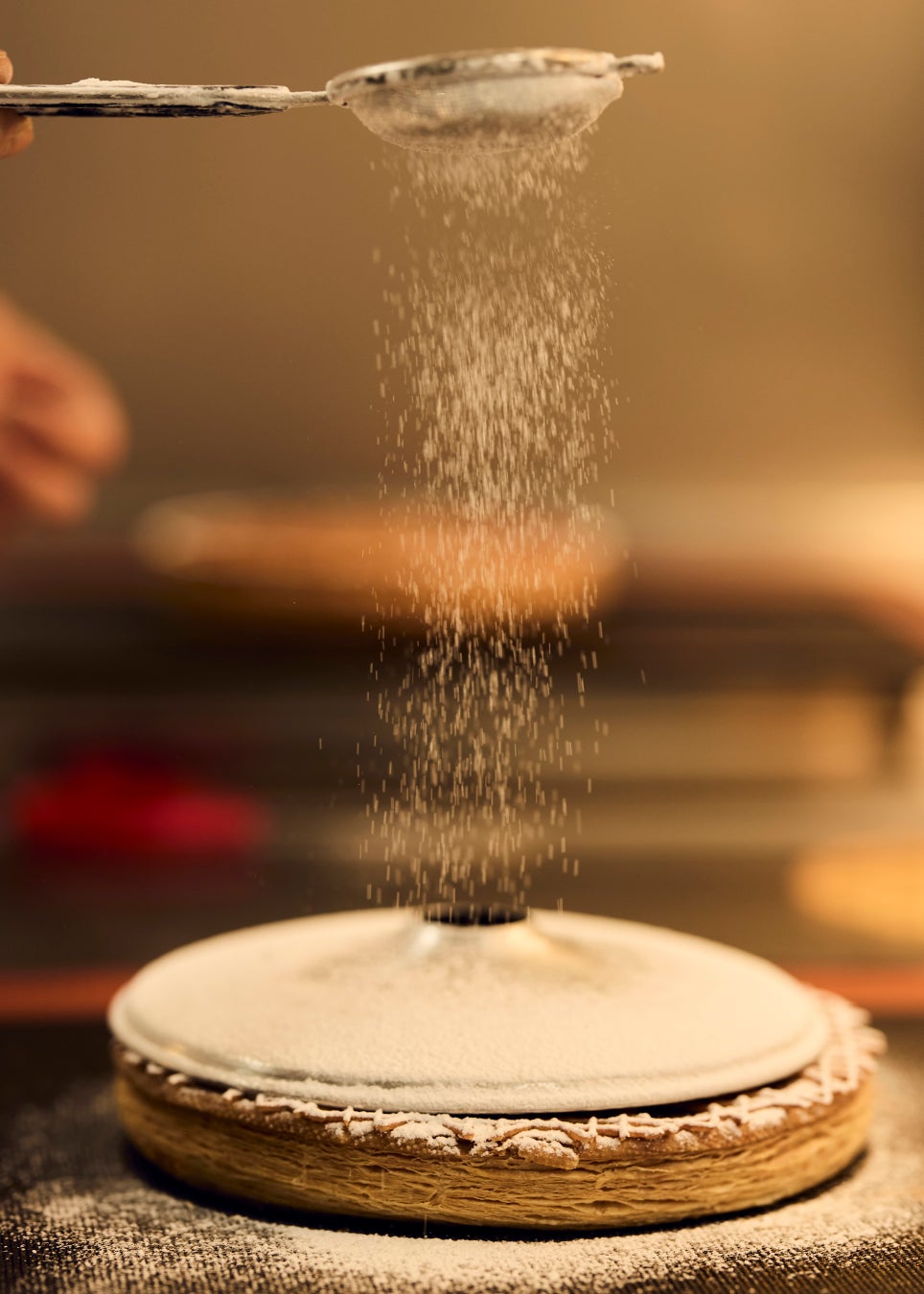 甘い喜びへのオマージュのように、ディオールはシェフのジャン・アンベールと彼のコラボレーター、ロミュアルド・ビザールによって考案された「ガレット デ ロワ」をお届けします。最上の瞬間を祝うための洗練されたスイーツはヘーゼルナッツとアーモンドのフランジパーヌ、そして軽いパイ生地で構成されており、魅惑的なひとときを約束します。ディオールの伝統を象徴するエレガントな「カナージュ」のラインがクリスピーな表面に描かれ、スター、四つ葉のクローバー、ミツバチ、薔薇といった創設者クリスチャン・ディオールの幸運のシンボルが交互にあしらわれたハンドペイントのガラスチャームが驚きを添えます。メゾンの歴史とムッシュ ディオールの「アール ドゥ ヴィーヴル(暮らしの芸術)」への情熱を讃えるこの甘美な作品は2025年1月3日から19日まで「30 モンテーニュ」の「ラ パティスリー ディオール」でご覧いただけます。
