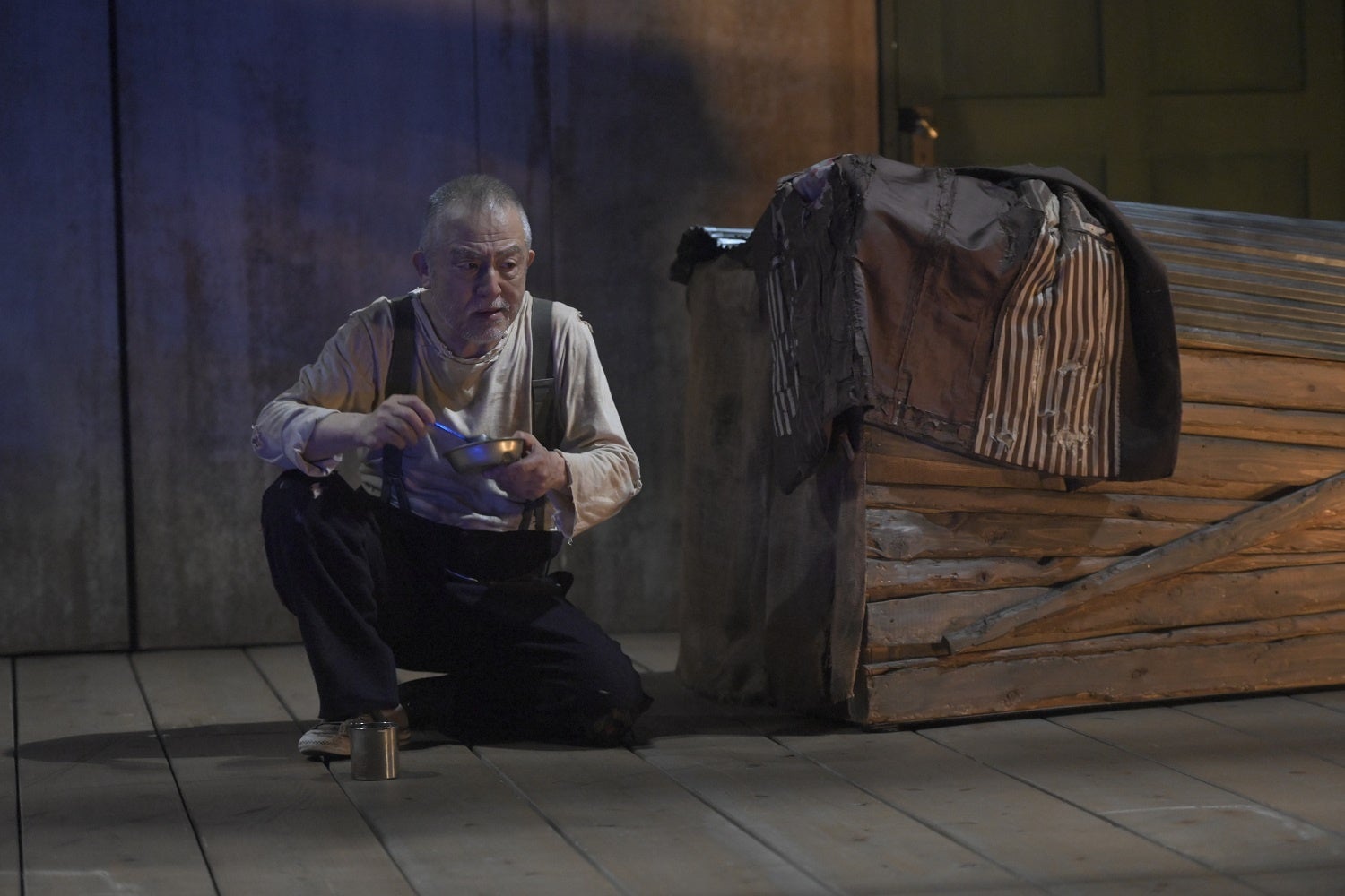 モリエールが描いた原作の見どころは、口がうまくて世渡り上手のスカパンが、若者の恋の手助けをし、威張った金持ち二人を手玉に取ってとっちめる“悪だくみ”っぷり。だが串田版は、ただ底抜けに陽気な喜劇ではない。いたずらしたり大騒ぎしたり、人々と一緒にいる時は明るく振る舞うスカパンだが、犬小屋のような家に戻って一人で過ごす場面などに、彼の孤独と貧しさがふと垣間見える。合間、合間にインサートされる底辺で暮らす男の「生活感」が、物語に陰影を与えるのだ。スカパンがアルレッキーノ(イタリアで16世紀ごろに生まれた喜劇「コメディア・デラルテ」の召使役・道化役)の仮面をつけ、一人無言で踊る場面も印象的。随所で流れる流浪の民の音楽は、根無草で生きてきたスカパンの、ハードだったであろう人生を思わせる。左右にサッと引かれ、どんどん場面を変化させ運んでいくブレヒト幕は、舞台にスピードとリズムを与えていた(幕の隙間から役者がちょっと顔を出すのもチャーミング)。