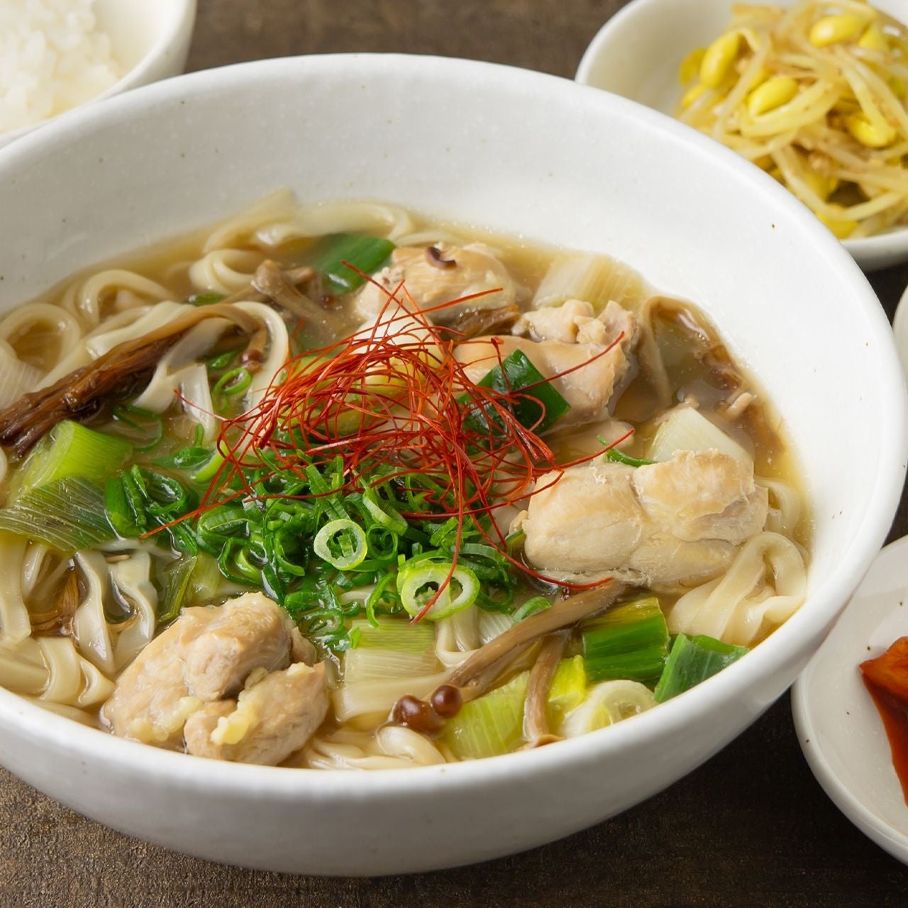 鶏肉や野菜をじっくり煮込んだスープの韓国風鶏うどん。