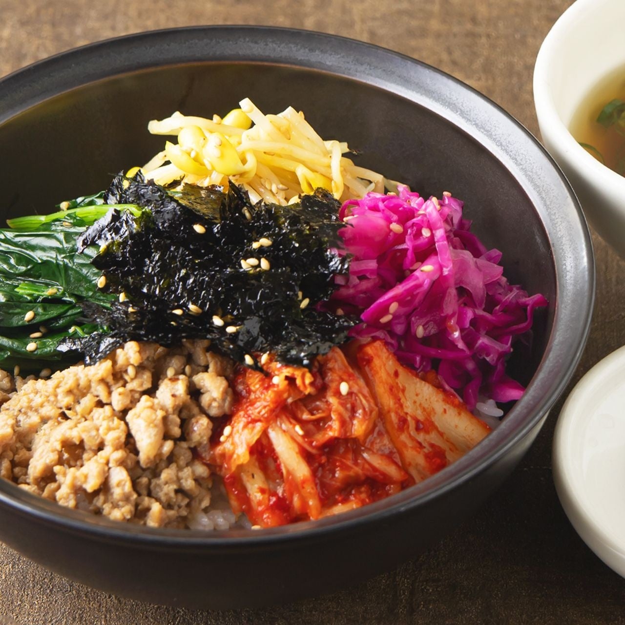 ピリ辛キムチと鶏そぼろが絶妙なピビンバ。よく混ぜてお 召し上がりください。