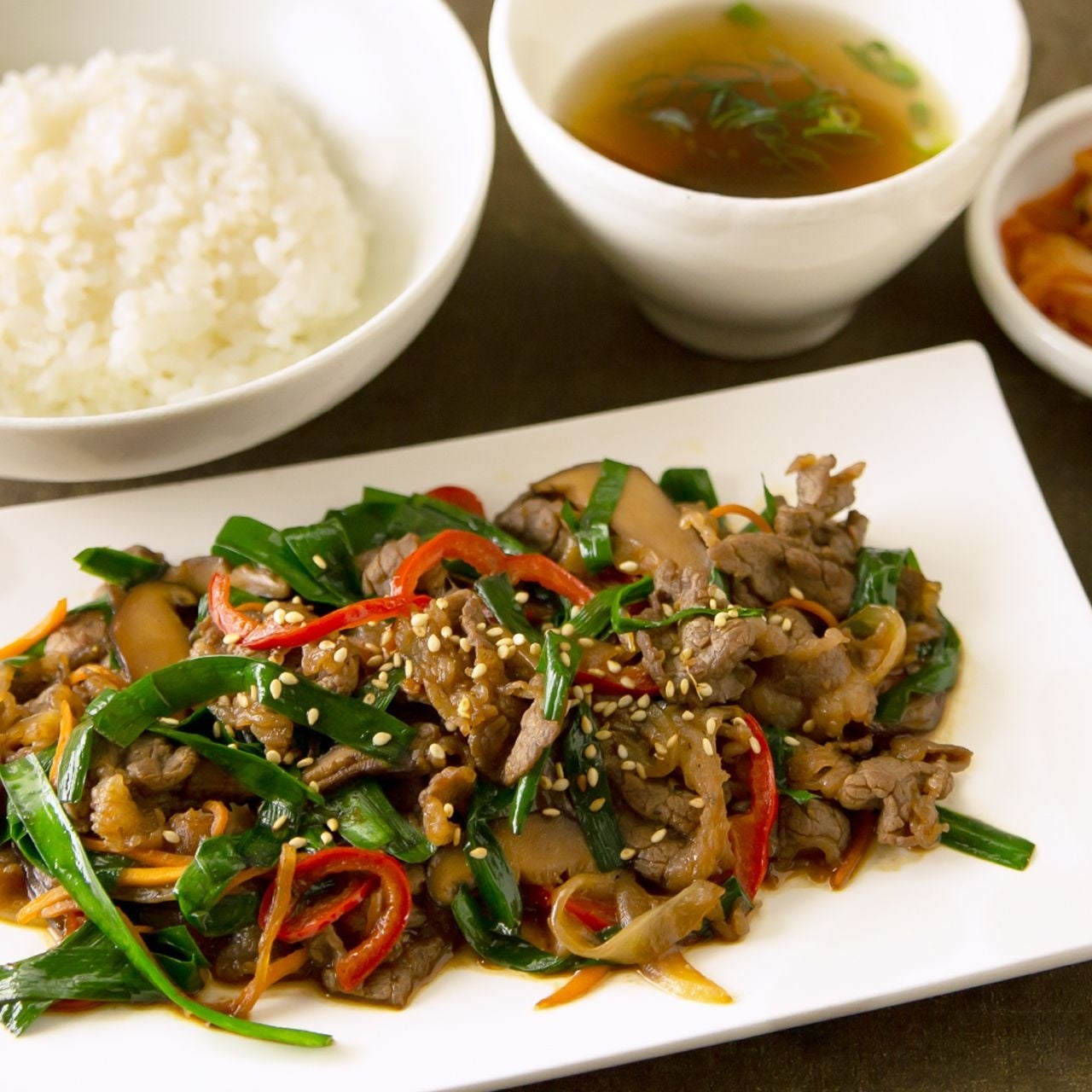 自家製タレで味付けされたプルコギとナムル、キムチの食欲をそそる組み合わせ。美味しく食べる秘訣はお皿の底からよく混ぜること!