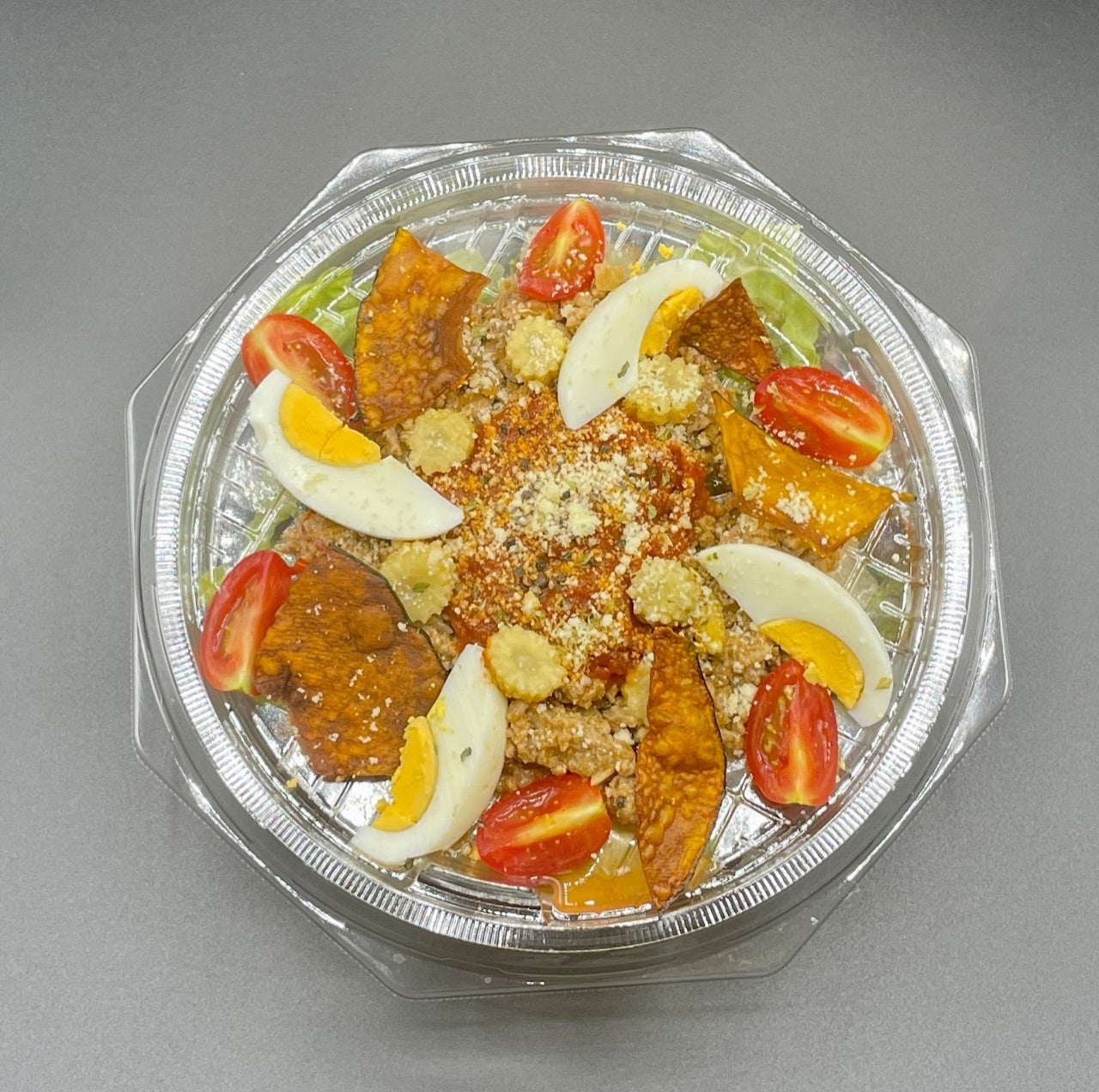 スパイシーな味付けのひき肉とサルサソース、ゆで卵、かぼちゃ、トマト、ヤングコーンの具材をパンサラダと合わせて食べる新しいスタイルのサラダ。低カロリーもポイントです。国産の材料のみで焼き上げる小麦処むくさんの美味しいフォカッチャが入った大満足のパンサラダです。ビールと一緒に是非お召し上がりください。