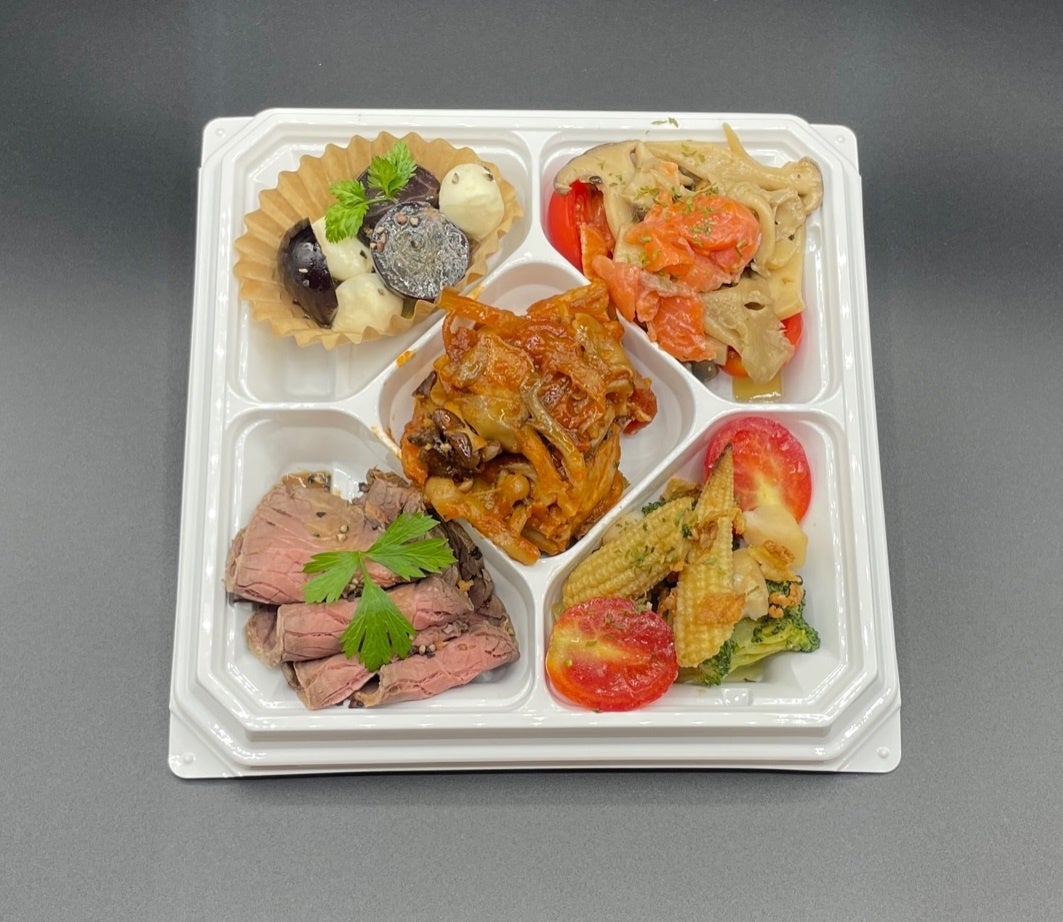 5種のデリが入った便利でお得な盛り合わせ。蓋を開けてテーブルに置けば、すぐに乾杯していただけます。ブドウのカプレーゼ、魚介デリ2種、お肉のデリ2種とバランスよく入っています。スパークリングや白ワインにピッタリです。
