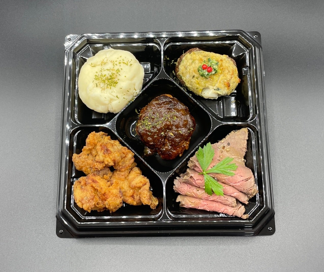 5種のデリが入った便利でお得な盛り合わせ。メインになる、ボリュームいっぱいのお肉のデリを中心に詰めました。自慢の手ごねハンバーグ(赤ワインに合わせるために生まれた濃厚デミグラスソース添え)、国産牛のローストビーフ、ブラックペッパーとレモンの風味のフライドチキン、椎茸とバジルの肉詰め、シンプルマッシュポテト。ボリュームたっぷりのメインセットです。