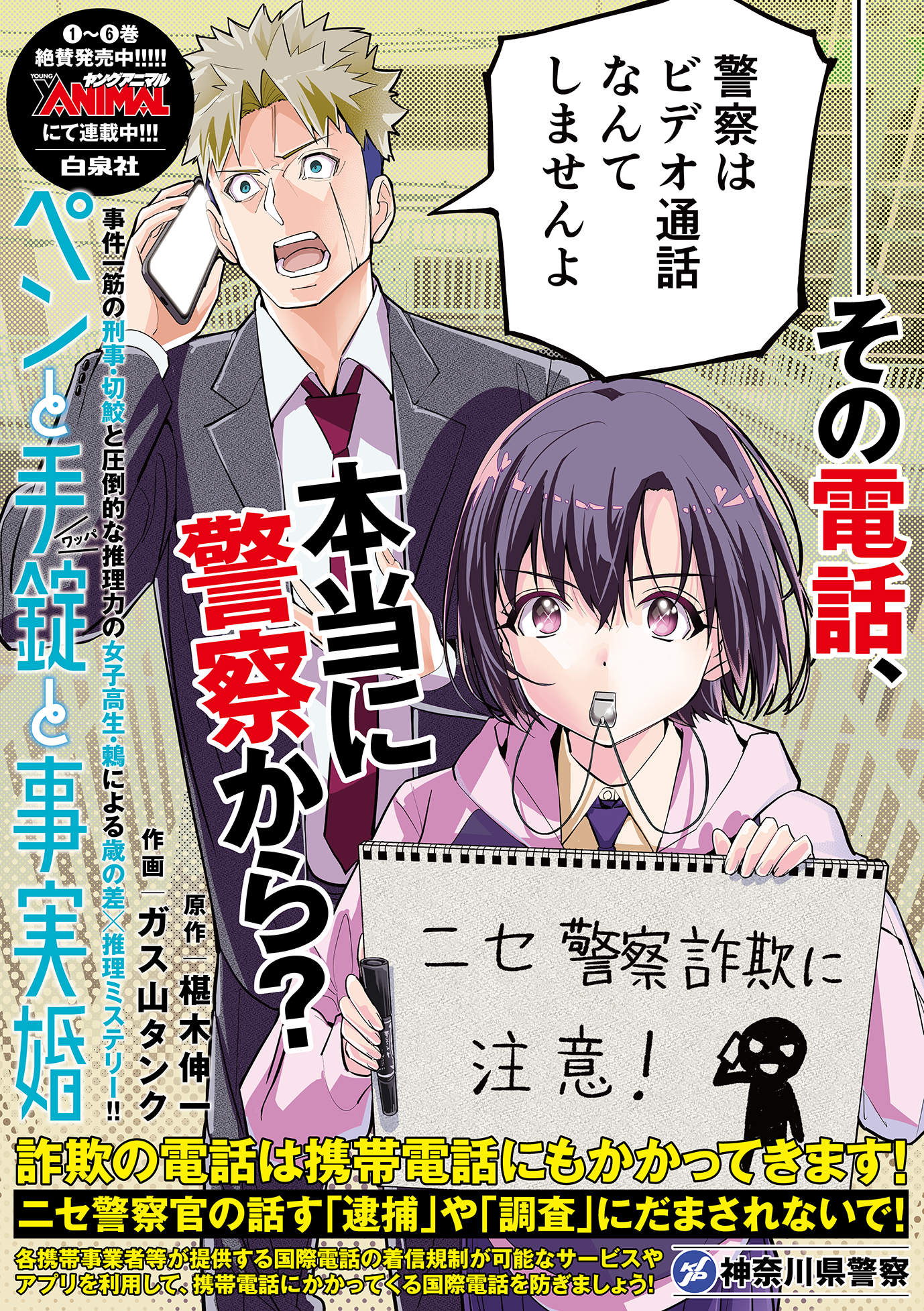 「ペンと手錠と事実婚」(原作:椹木伸一、作画:ガス山タンク)では正義感の強い刑事・切鮫と名推理が冴える少女・鶫が、バディとなって事件を解決する。今回は全国的に被害が拡大している警察詐欺を注意喚起するため、神奈川県警察とのコラボレーションが実現した。