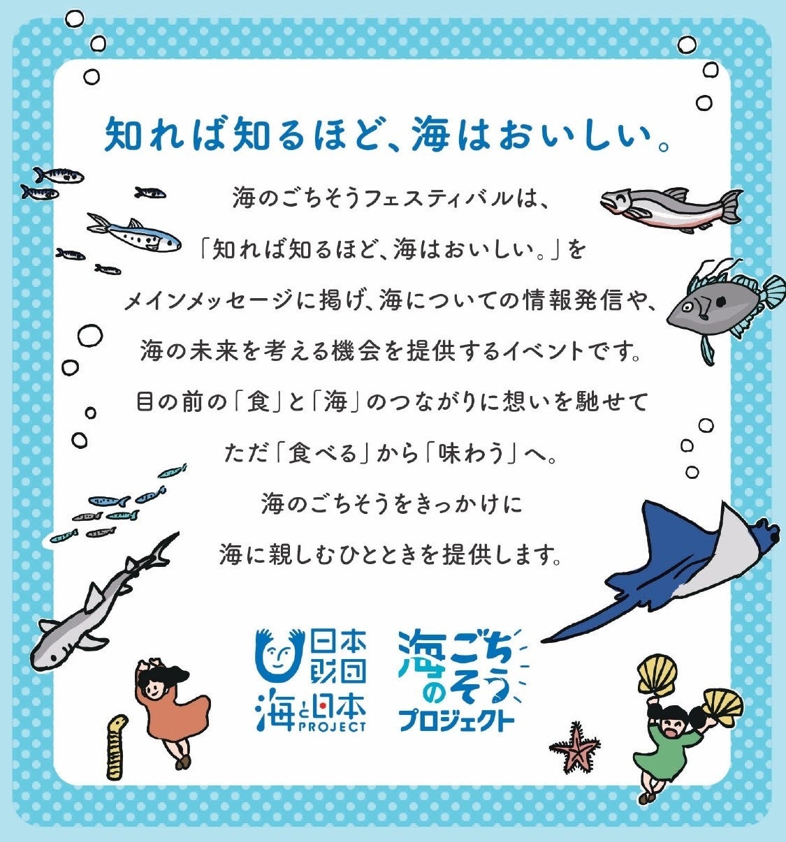 「海のごちそうフェスティバル」は、「知れば知るほど、海はおいしい。」をメインメッセージに掲げ、海のストーリー・背景を伝え、食を通じて多くの方に海に興味関心をもってもらう試み「海のごちそうプロジェクト」の集大成として2021年から開催している海と食の一大イベントです。