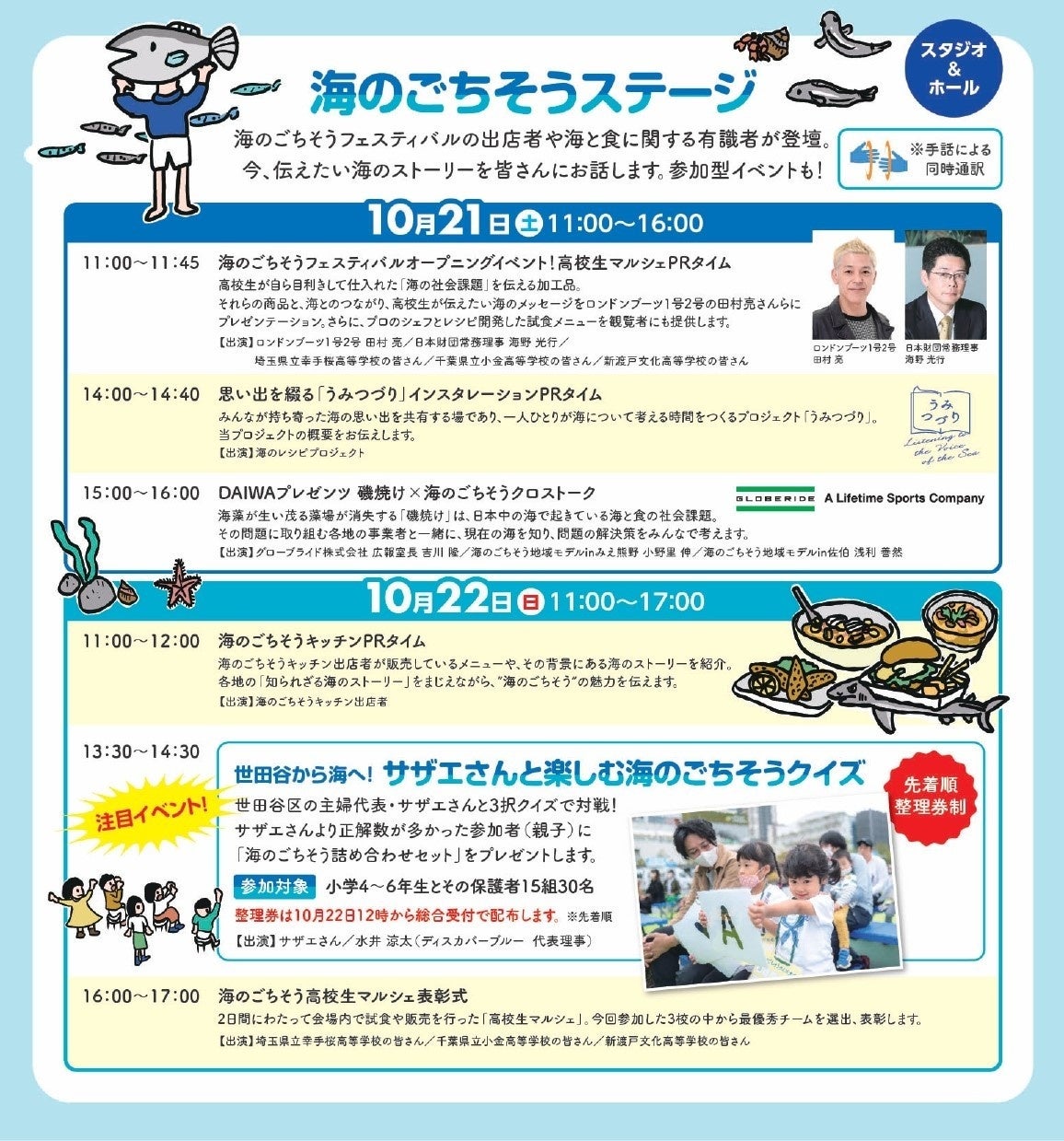 22日(日)13:30からは、世田谷区の主婦代表としてサザエさんが登場。来場者と一緒に、海にまつわる3択クイズに挑戦します。全問正解者には「海のごちそう詰め合わせセット」をプレゼント。参加対象は小学4~6年生とその保護者15組30名。当日12:00より総合受付で先着順に整理券を配布します。