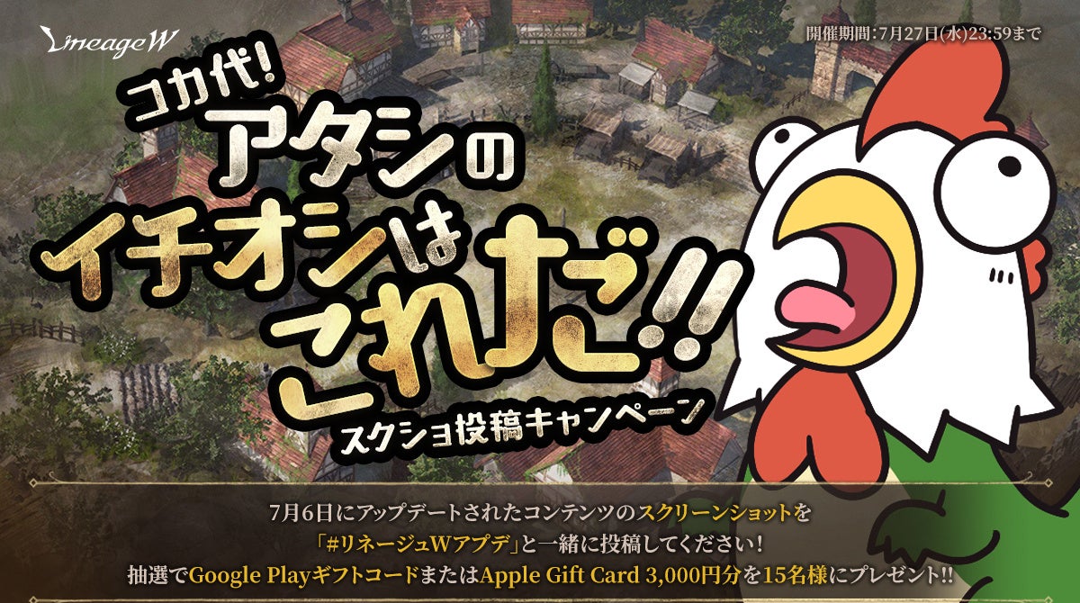 「リネージュW」公式Twitterアカウント(@LineageW_JP)をフォロー、ハッシュタグ「#リネージュWアプデ」をつけて、7月6日にアップデートされた内容のスクリーンショットを投稿された方の中から、抽選で15名様に、Google Playギフトコード、またはApple Gift Card 3,000円分をプレゼントします。