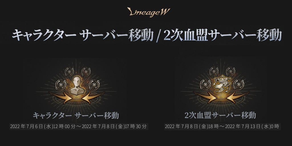 本日より2回目の「キャラクターサーバー移動」を、7月8日(金)より「2次血盟サーバー移動」を開始します。