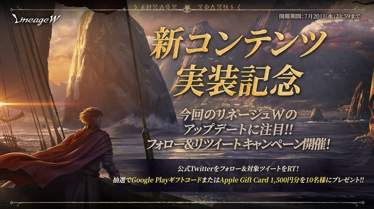 「リネージュW」公式Twitterアカウント(@LineageW_JP)をフォローし、対象ツイートをリツイートした方の中から抽選で10名様に、Google Playギフトコード、またはApple Gift Card1,500円分をプレゼントします。