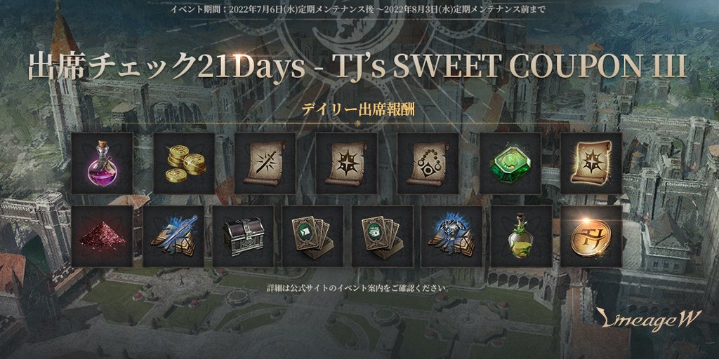 『リネージュW』変身やマジックドールの合成挑戦や装備復旧にチャレンジできる「出席報酬21Days – TJ‘s SWEET COUPON III」登場!