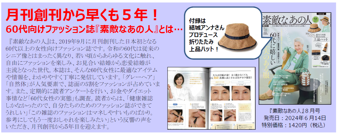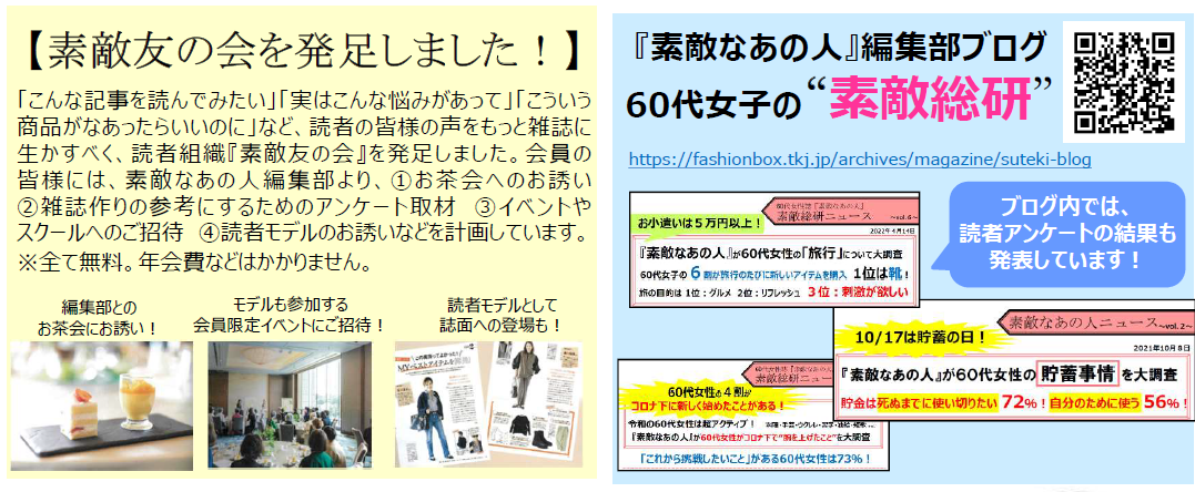 いまの60代は従来のシニア像と異なり、トレンドに敏感で若々しく、ファッションやメイクを楽しむ現役世代ですが60代向けの商品や情報が乏しく、選択肢が少ないことに悩んでいます。そこで『素敵なあの人』では、読者組織「素敵友の会」を結成したり、編集長を中心に読者とのお茶会を実施したりと、60代女性の生の声を聞く機会を