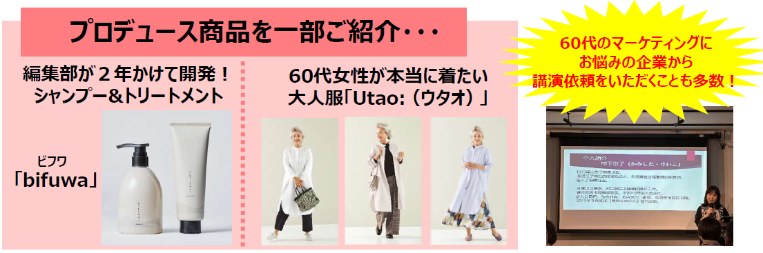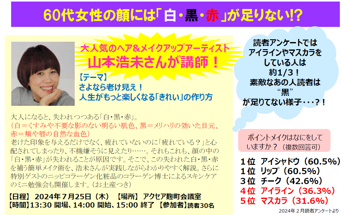 多く設けています。創刊当初から「メイク」に関するお悩みは多く挙がっており、周年イベントなどでも毎回メイクレッスンは人気なことから、今回カルチャースクールの第1回講座として実施する運びとなりました。今後も、新しい60代女性が生き生きと過ごせる社会に向けて、その一翼を担えるよう尽力していきます。