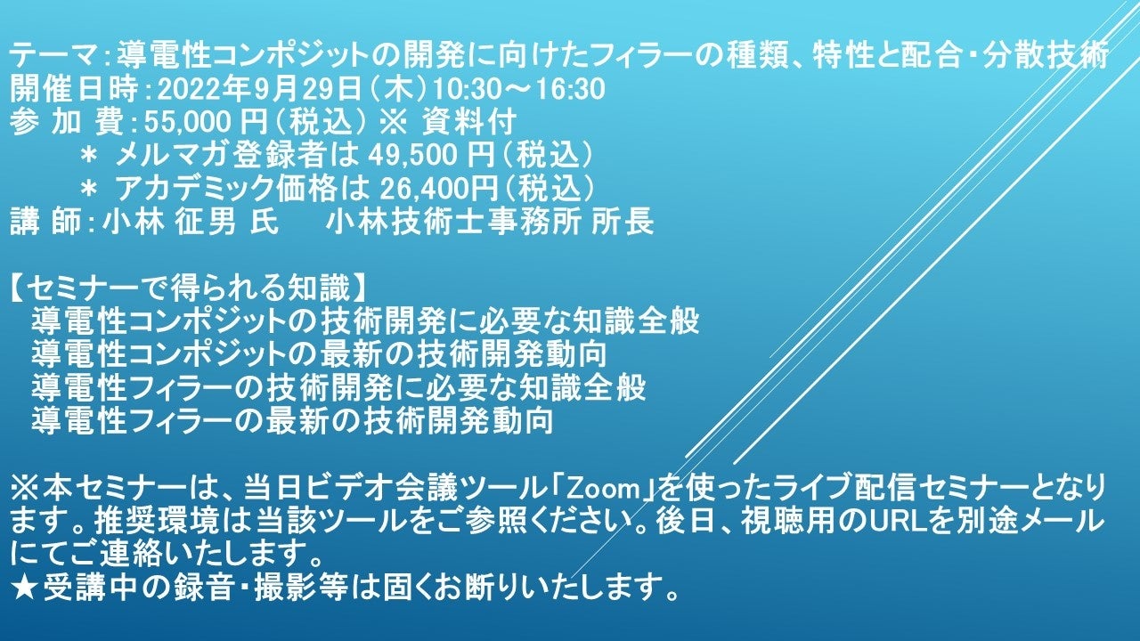 先端技術情報や市場情報を提供している(株)シーエムシー・リサーチ(千代田区神田錦町: https://cmcre.com/ )では、 各種材料・化学品などの市場動向・技術動向のセミナーや書籍発行を行っておりますが、 このたび「導電性コンポジットの開発に向けたフィラーの種類、特性と配合・分散技術」と題するセミナーを、 講師に小林 征男 氏 小林技術士事務所 所長)をお迎えし、2022年9月29日(木)10:30より、 ZOOMを利用したライブ配信で開催いたします。 受講料は、 一般:55,000 円(税込)、 弊社メルマガ会員:49,500 円(税込)、 アカデミック価格は26,400 円(税込)となっております(資料付)。