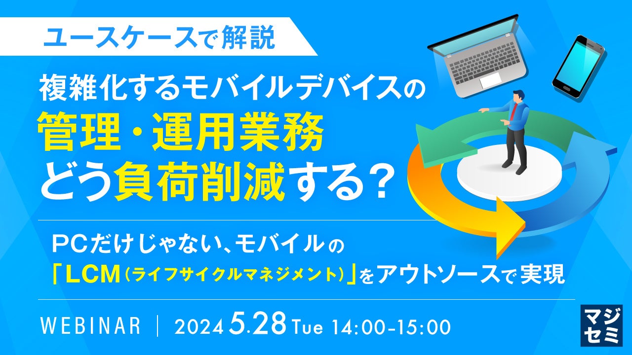 本セミナーでは、モバイルデバイスのLCMをアウトソースすることで、運用負荷を大幅に軽減する方法を解説します。LCMのアウトソースで運用を効率化している大手企業の実践事例を、具体的なユースケースとともにご紹介予定です。モバイル運用や管理に悩む担当部署の方はぜひご参加ください。