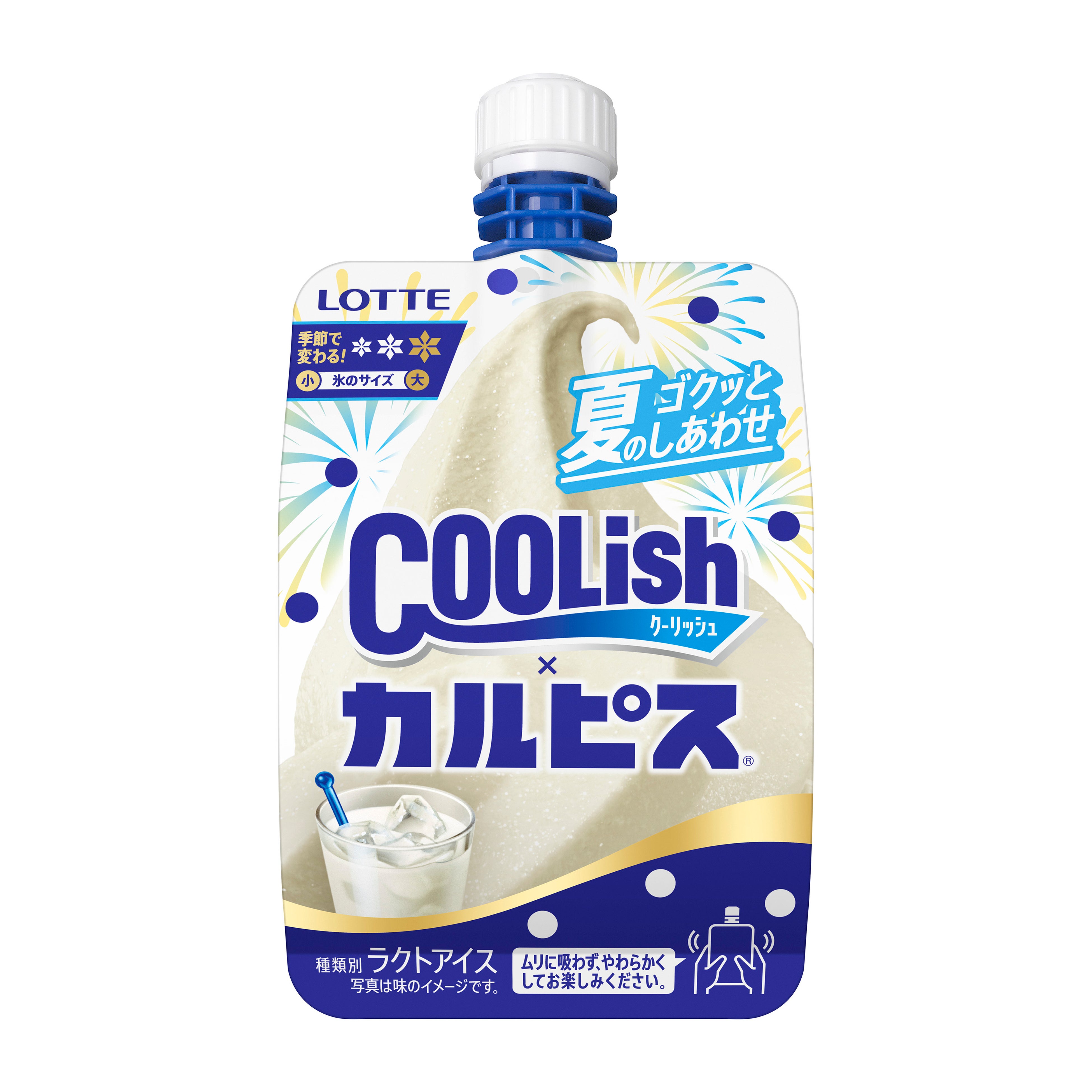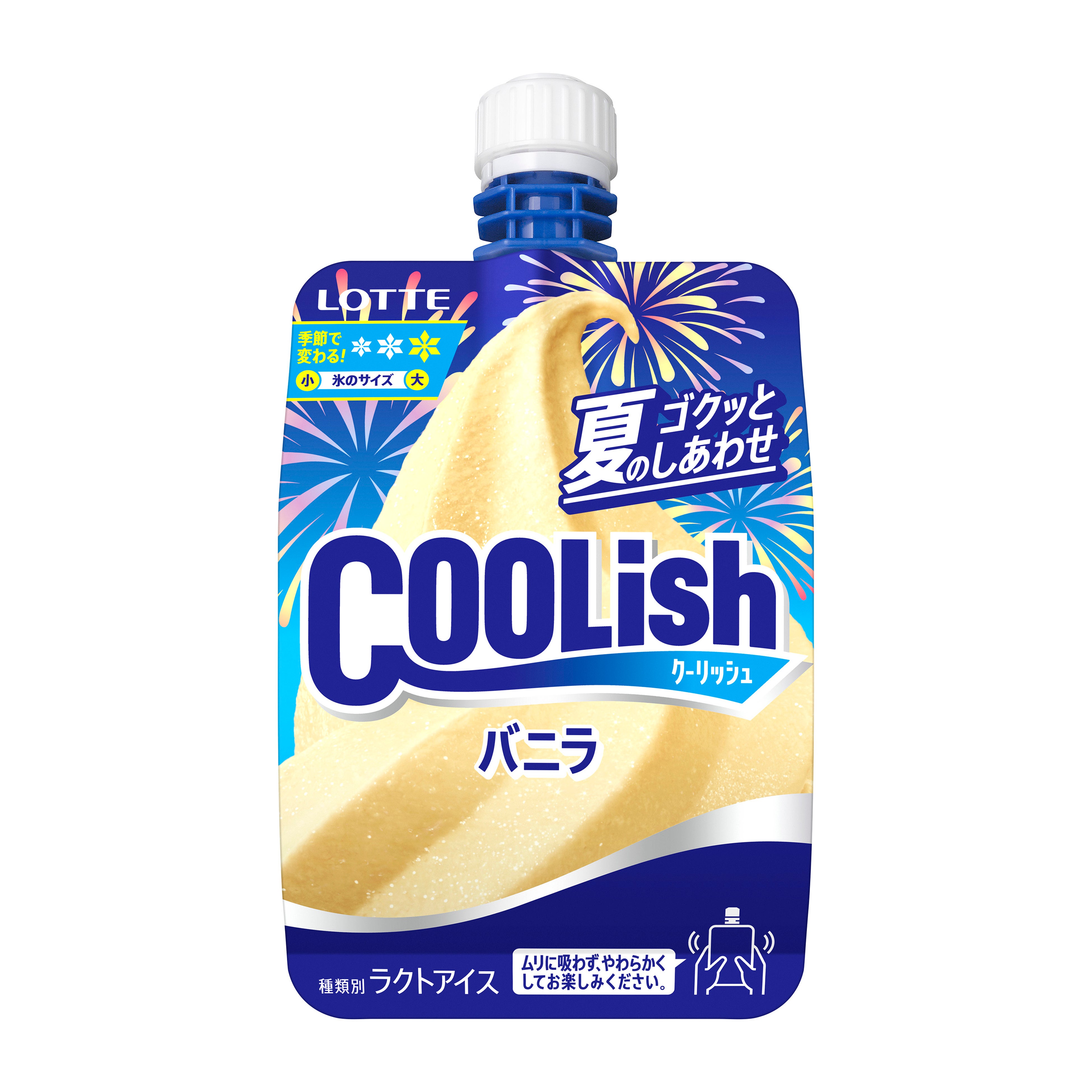通年販売をしている「クーリッシュ」3品を6月下旬より夏季限定品質で順次リニューアル発売いたします。夏季限定でアイスの中に入っている微細氷のサイズを大きくし、比率も高めることで、シャリっとした食感と冷たさが強まり、より夏にぴったりな「クーリッシュ」です。季節で微細氷の大きさを変える施策はこれまでも行なっていましたが、よりお客様に伝えていきたく「氷の大きさグラフ」を今回デザインに組み込んでいます。花火をあしらった見た目からも夏いっぱいの「クーリッシュ」です。夏にぴったりの冷涼感とシャリッとした食感とともに夏の情緒もお楽しみください。