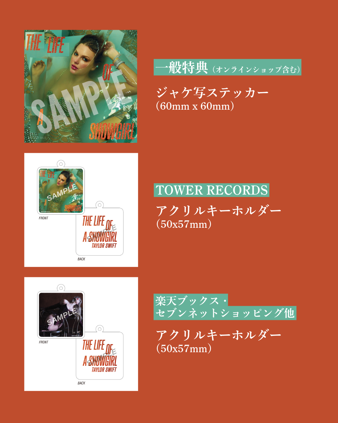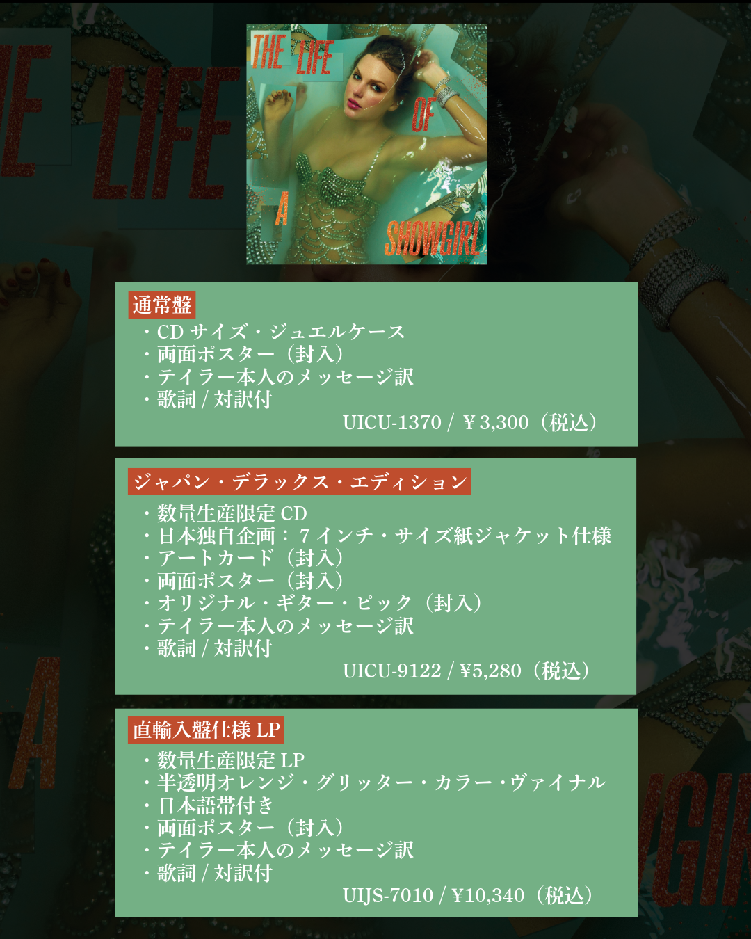 10月3日に発売され、リリース初日だけで今年全米で最も売れたアルバムとなったテイラー・スウィフトの新作アルバム『ザ・ライフ・オブ・ア・ショーガール』。本作の国内盤を、ジュエルケースの通常盤CD、7インチ・サイズ紙ジャケット仕様でオリジナル・ギター・ピック付きのジャパン・デラックス・エディションCD、日本語帯付きの直輸入盤仕様LPの3形態でリリースします。お買い上げの方には先着で購入特典をプレゼントします。