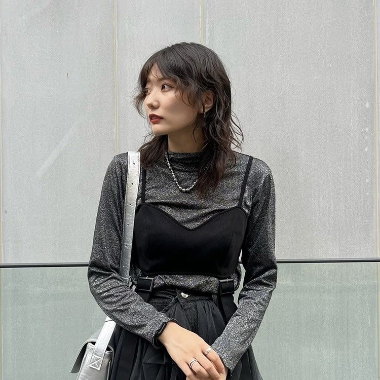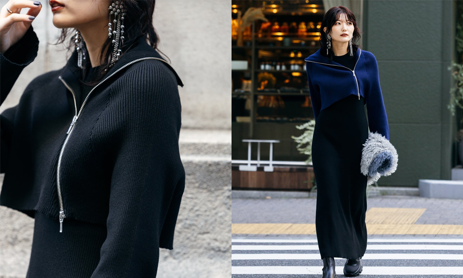 ショート丈トップスとロング丈ワンピースの最強タッグは、スタイルアップ見えも叶うバランス感。上下同素材だからミニマルで大人な雰囲気に。会食やパーティーにもぴったり。